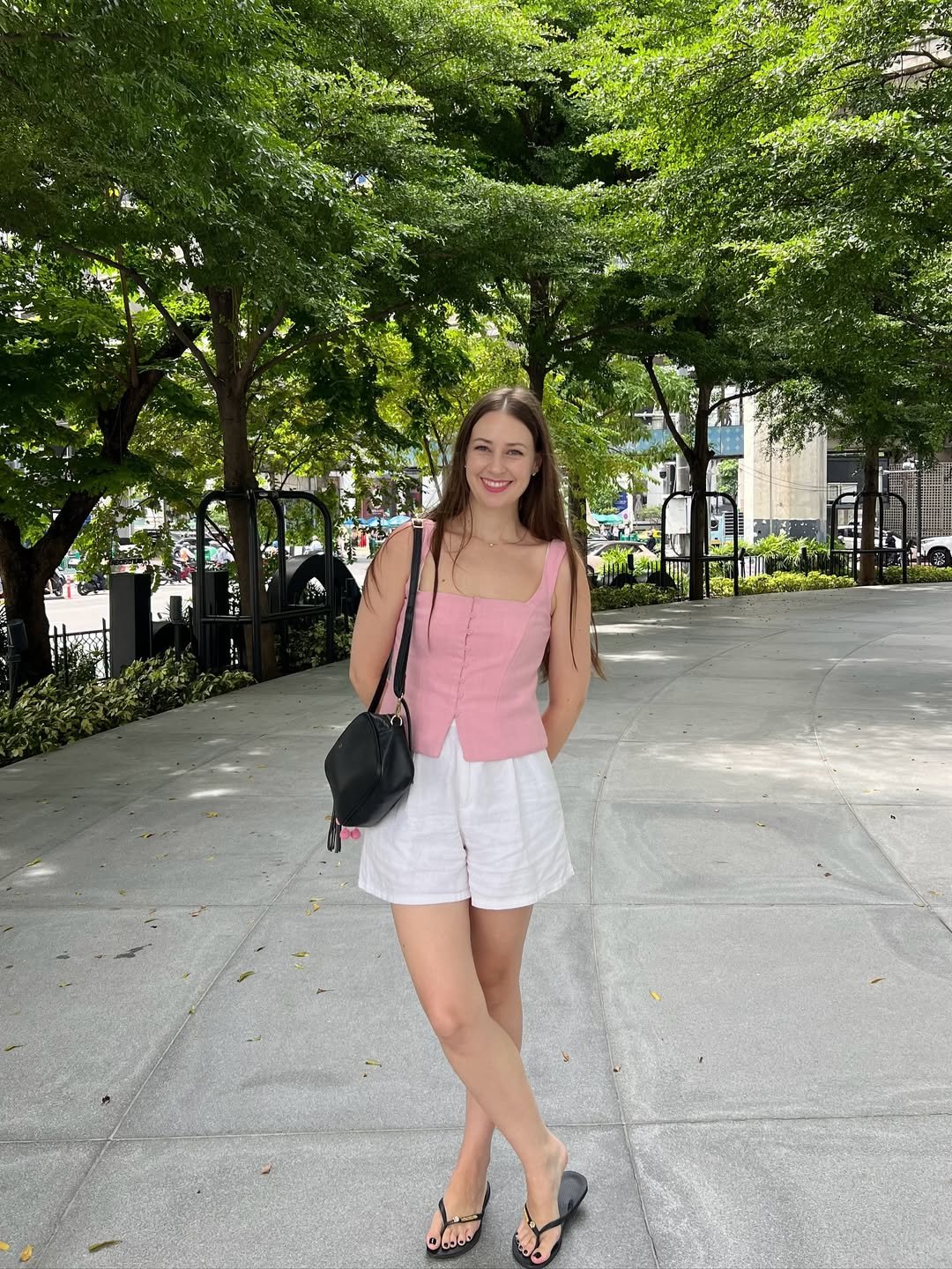 With her rose-pink corset top and breezy white shorts, @nataliekanchanawat channels the sweetest vacation-core vibe. The black accessories—mini bag and thong sandals—add just the right amount of contrast to this otherwise soft palette.