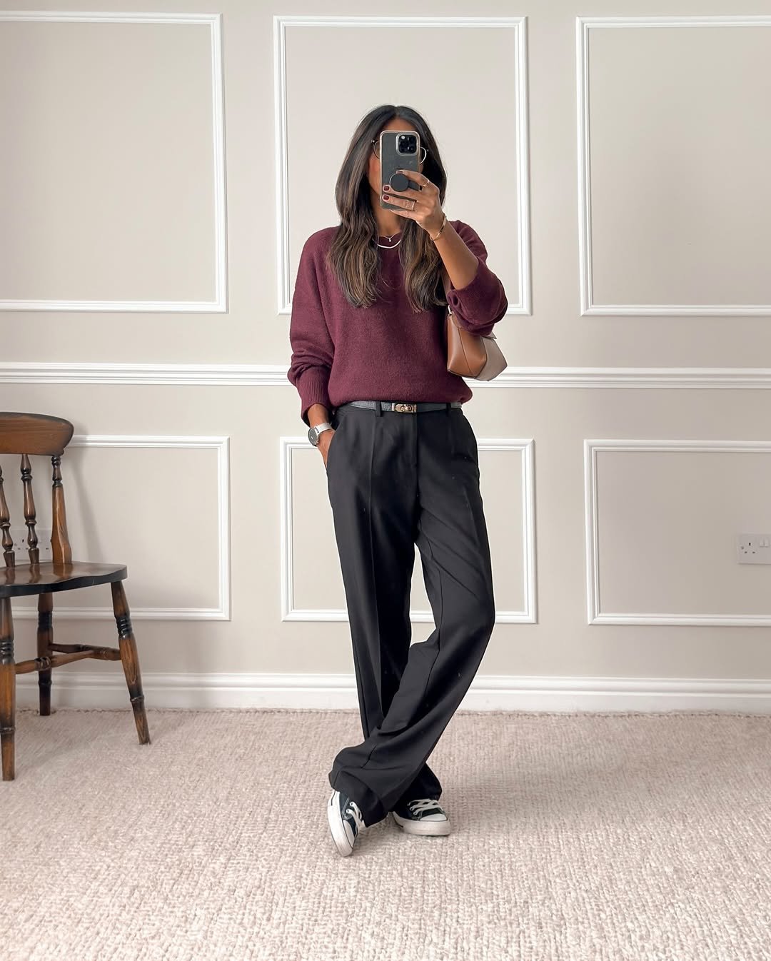 Nothing feels more timeless than a deep burgundy knit and tailored black trousers. @neetastarling leans into the richness here, pairing her cozy sweater with sleek pants and black Converse. It’s casual, but not careless.