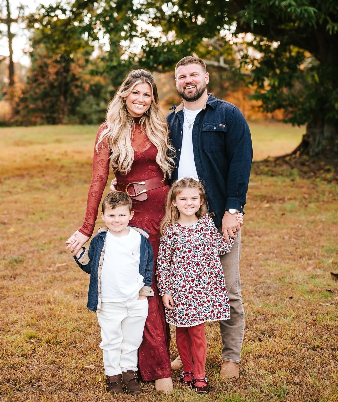 This family captured the sweetness of fall with a soft, romantic twist. Think rust tulle, cotton eyelet, and sandy neutrals that feel gentle and warm. The girls in twirl-worthy dresses, the parents in breezy, laid-back fits—it’s boho meets barefoot wonder.