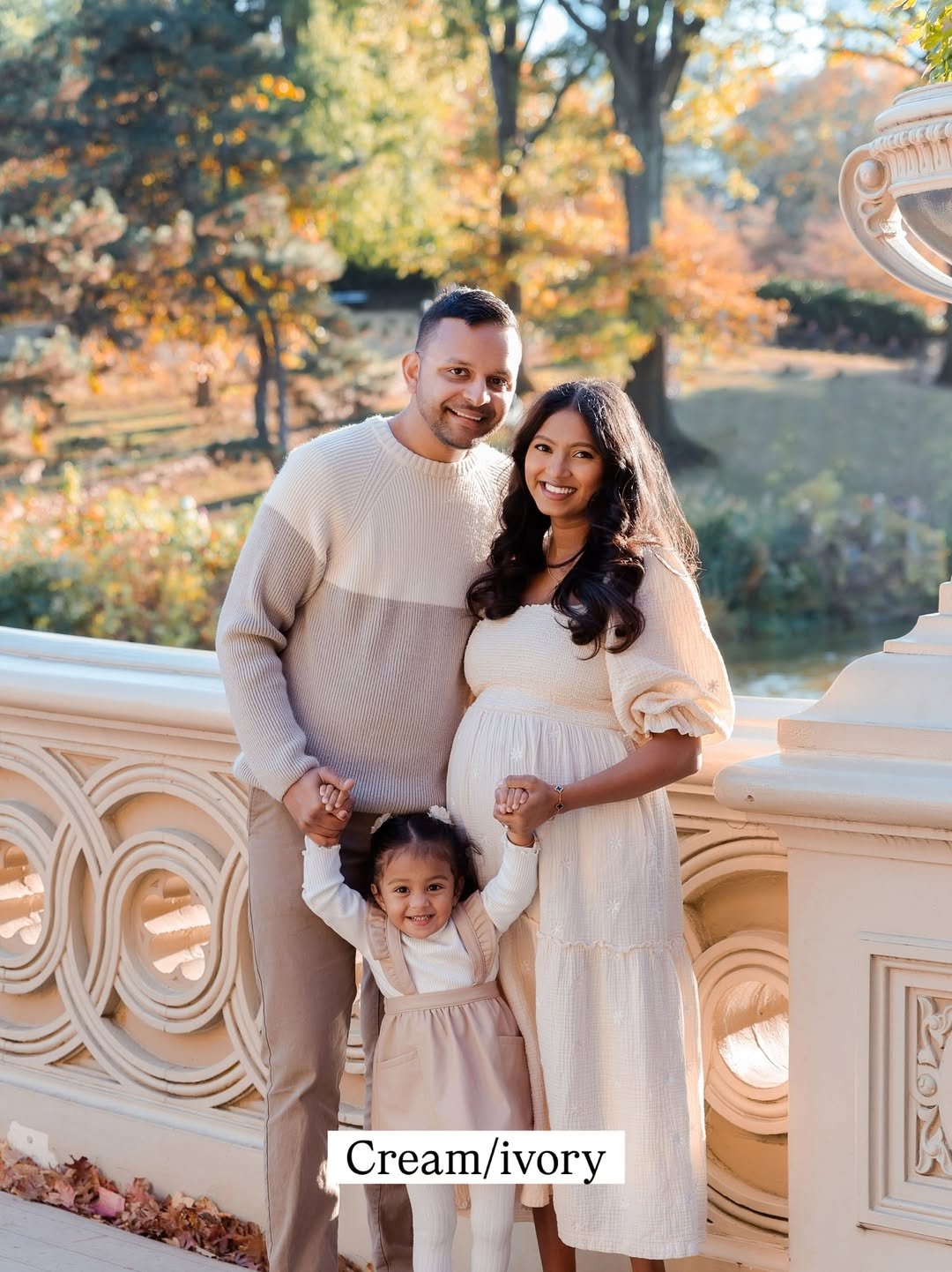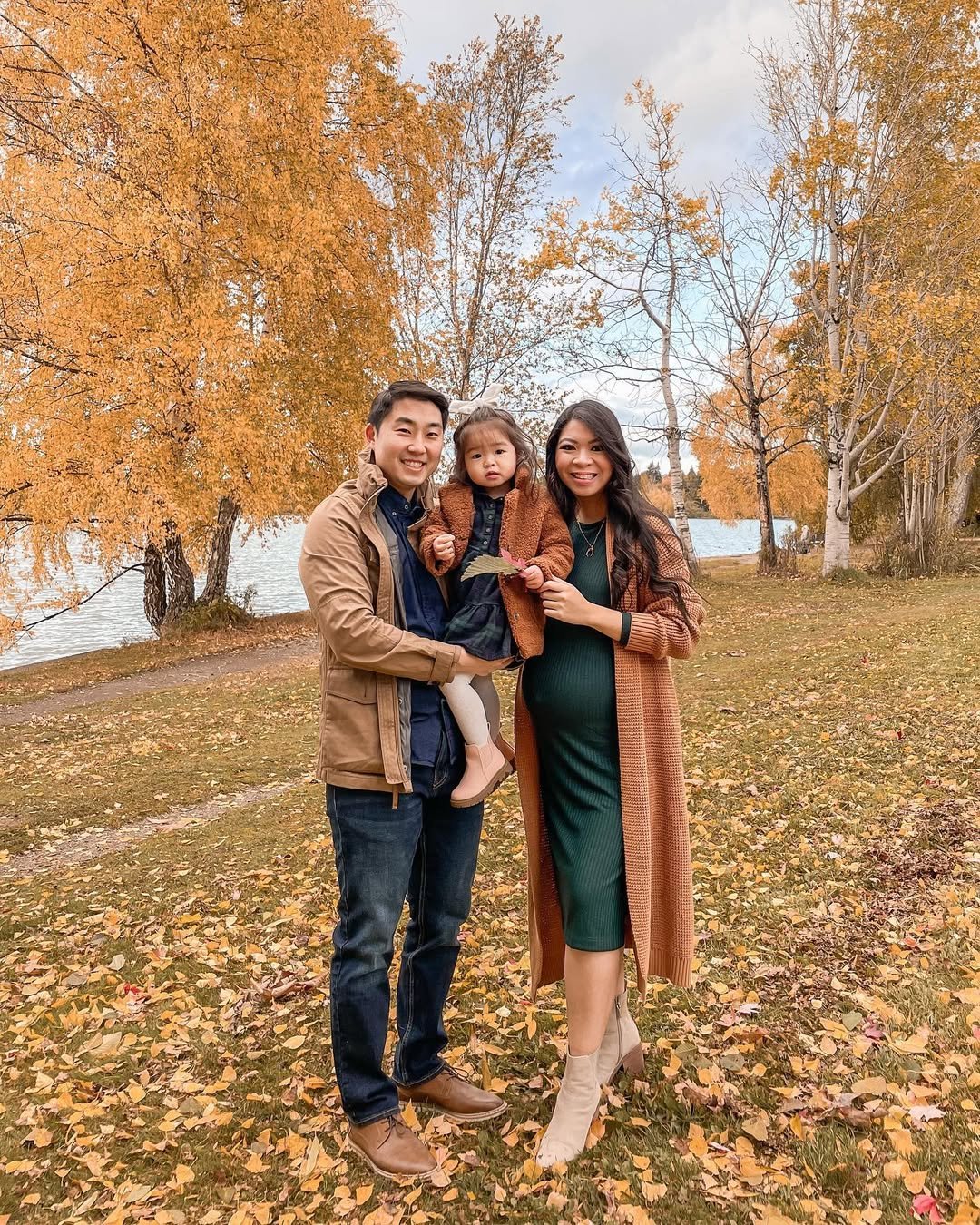Fallen leaves and lake breezes never looked better. This trio went for classic autumn tones—muted green, cozy rust, and deep navy—layered in a way that feels lived-in, not overstyled. The daughter’s mini teddy coat is adorable, and mom’s bump-hugging dress with a longline cardigan? So elegant.