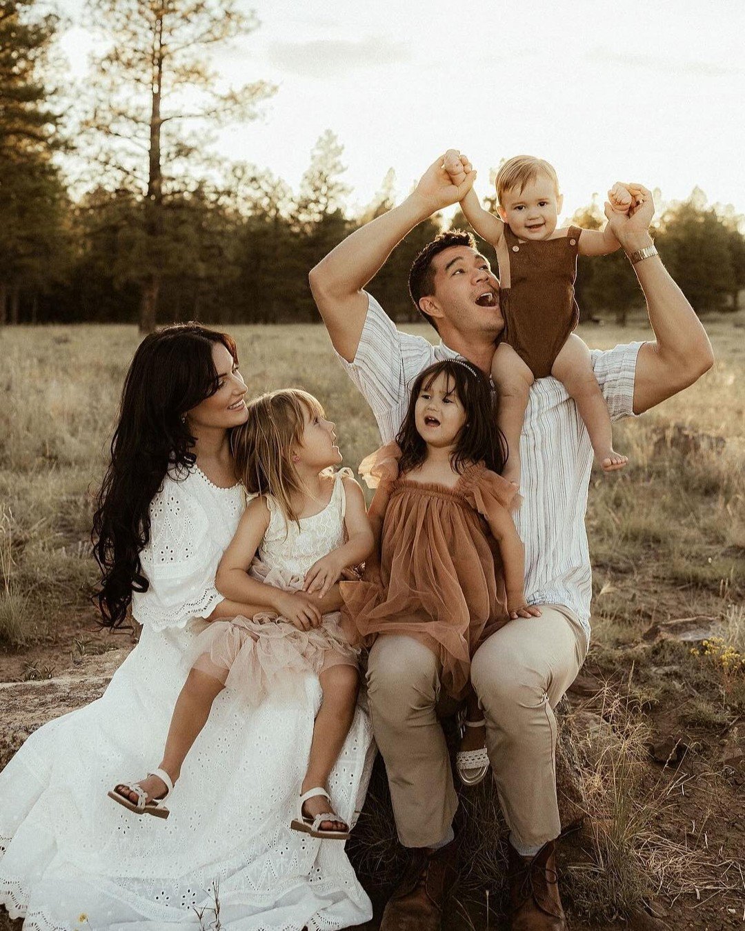 If joy had a color palette, this would be it. Coral, olive, and soft earth tones bring warmth and vibrancy, but it’s the energy between these three that really shines. The little one perched on dad’s shoulders in her red dress? Perfection.