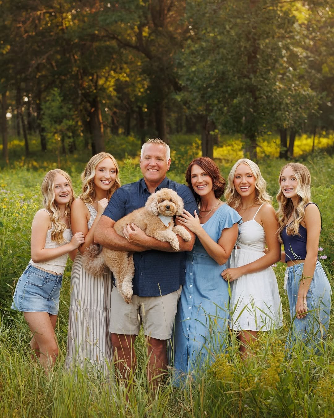 Nothing says “joy” like this golden field moment. The whole family is wrapped in soft, neutral tones—chambray blues, creams, and summer whites—that play perfectly with the lush greenery and warm sunlight. And that puppy? The ultimate fluffy accessory.