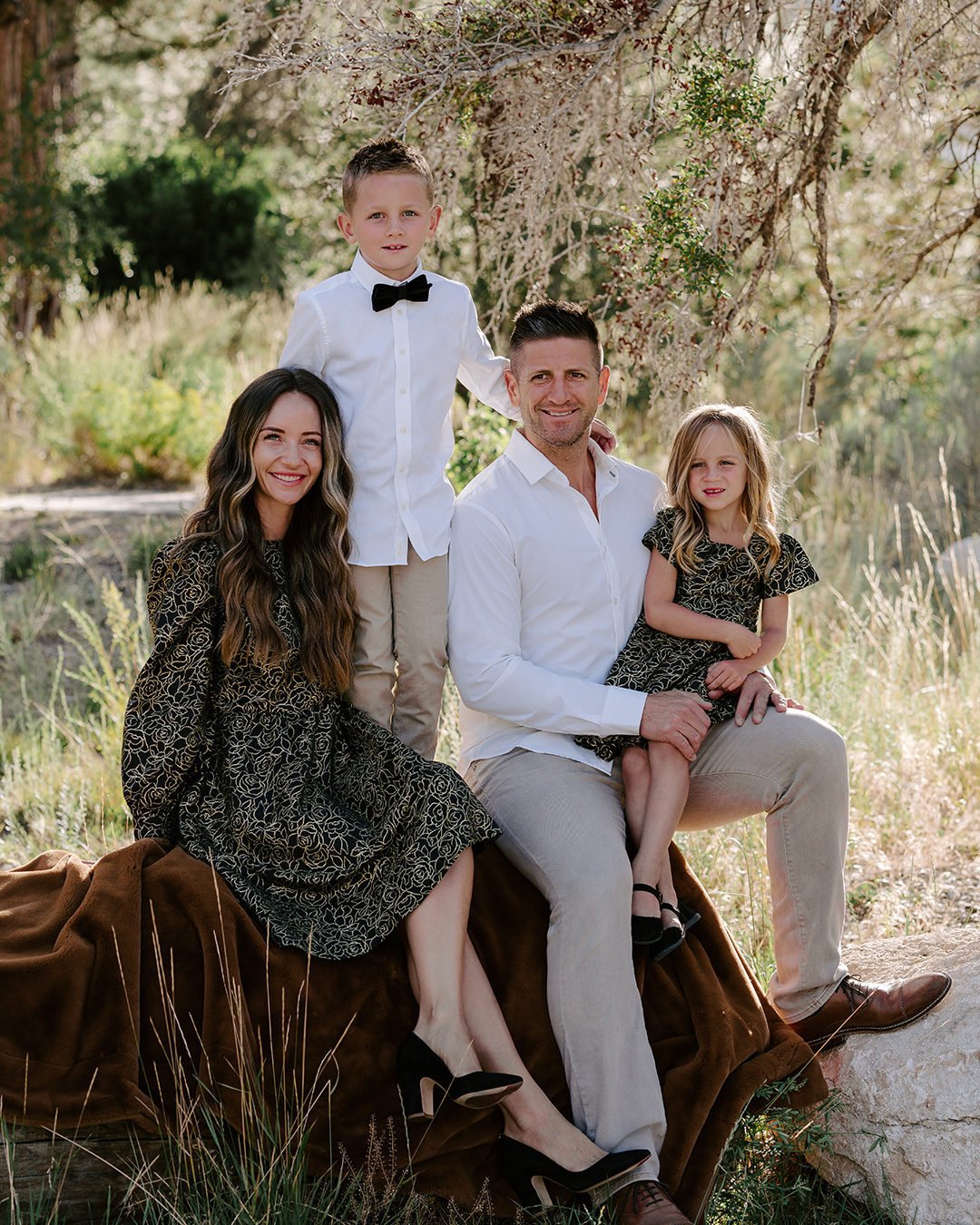 The golden hour light is doing the most here—and so is this family’s chemistry. Mom’s dark floral dress adds depth, while her daughter’s white boots and caramel skirt bring that editorial pop. The boys coordinate in rust, green, and beige without feeling matchy-matchy.