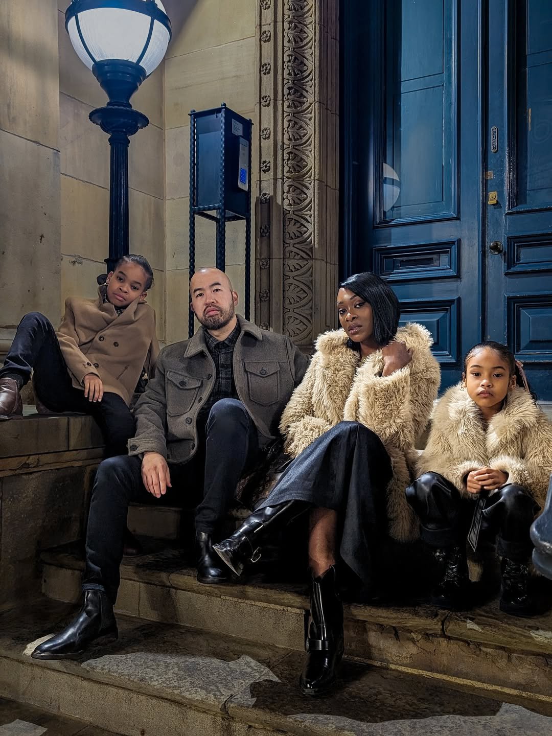 This family owned the nighttime setting with layers that feel bold, rich, and elevated. Faux fur, wool, leather—the textures are doing all the work. The girls’ matching coats and shiny black boots look straight out of a fashion editorial, while the city backdrop brings that grown-up contrast.