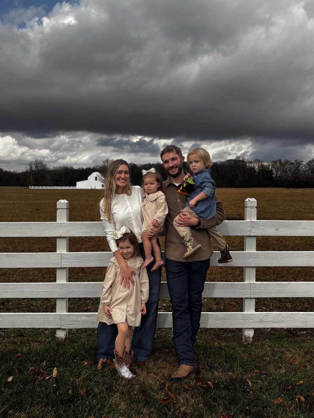 A stormy sky never looked so dreamy. The palette here—off-white, wheat, denim blues—matches the moody lighting and white fence like a dream. The kids in soft neutrals and boots bring that sweet southern vibe, while mom’s satin blouse adds a quiet glow.