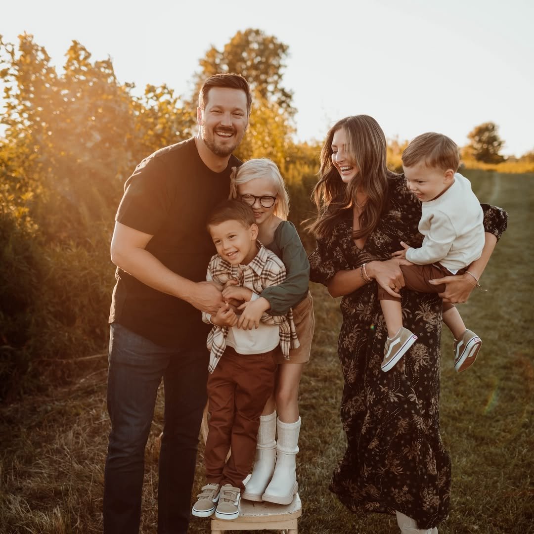 This woodsy moment is rich with texture and tone. Deep olives, chocolate browns, and hints of oatmeal play so well with the golden sunset filtering through the trees. The kids’ outfits feel vintage-inspired, while mom’s high-waisted denim and fitted top add that modern edge.