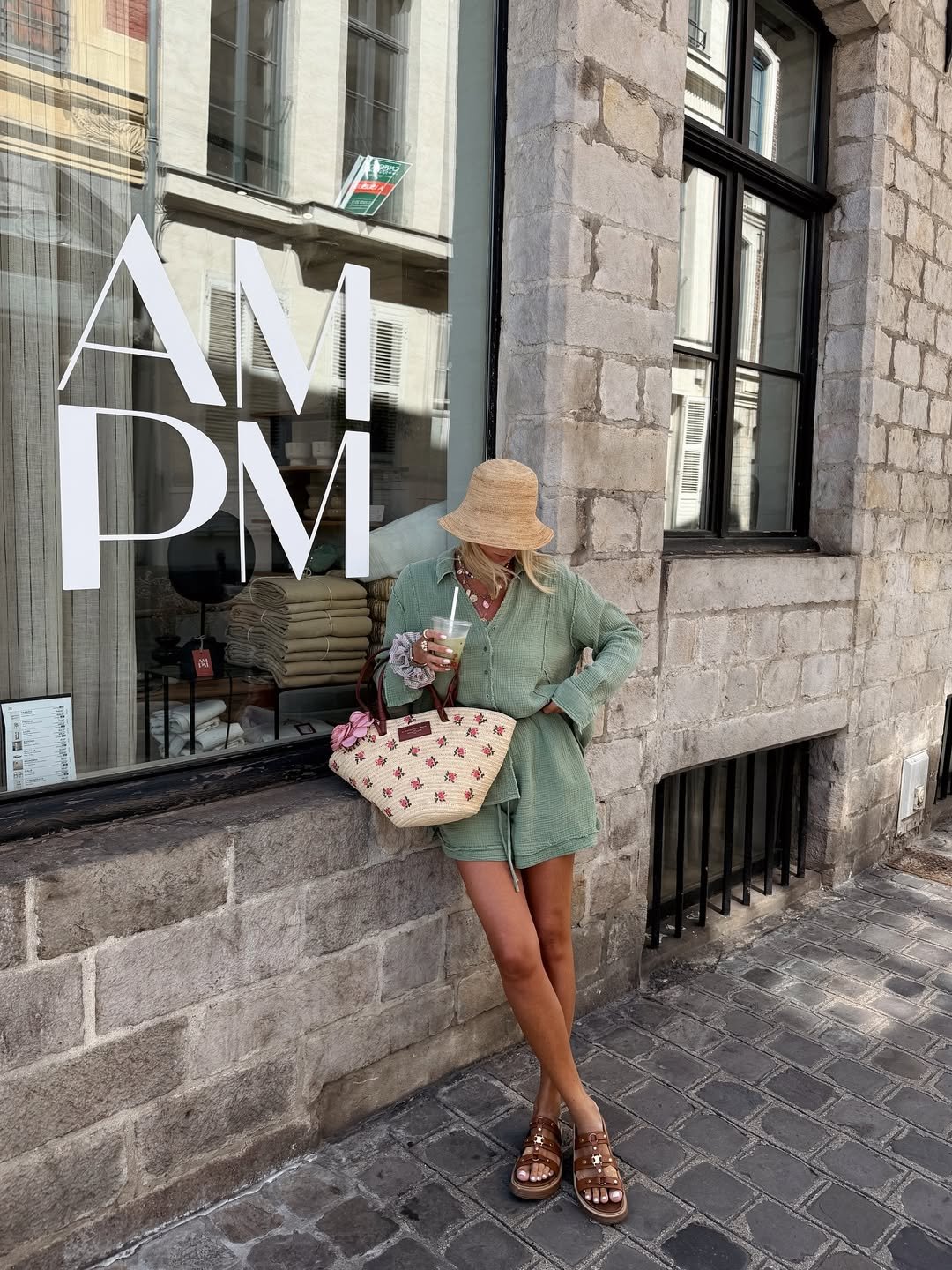 This look feels like a quiet little moment outside a favorite neighborhood café. The soft sage two piece set has that relaxed vacation energy, light, breezy, and easy enough for wandering cobblestone streets with an iced drink in hand.