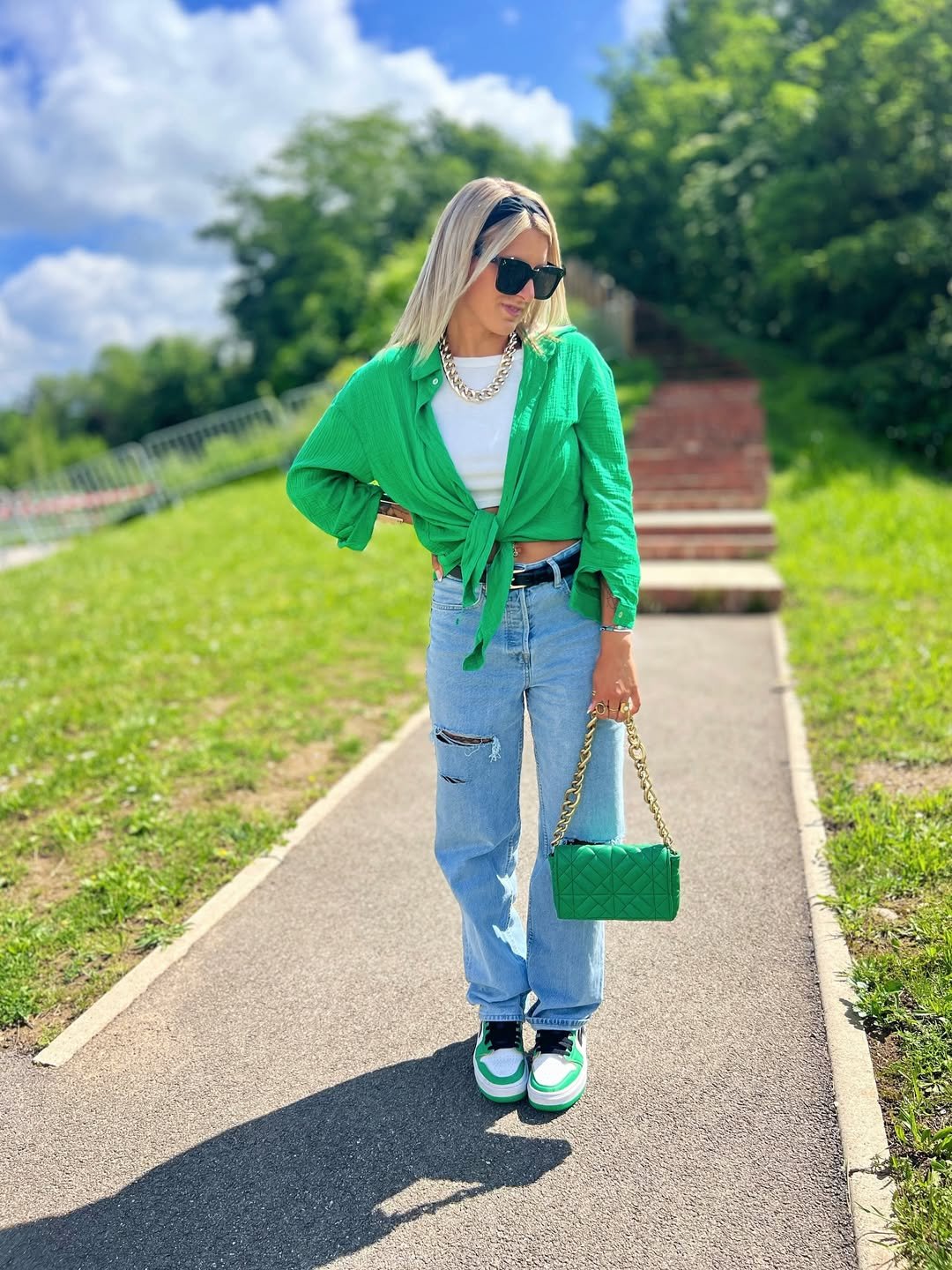 There’s something effortlessly cool about this relaxed denim and green combo. The tied green shirt layered over a simple white tank adds a laid back vibe that feels perfect for a weekend stroll.