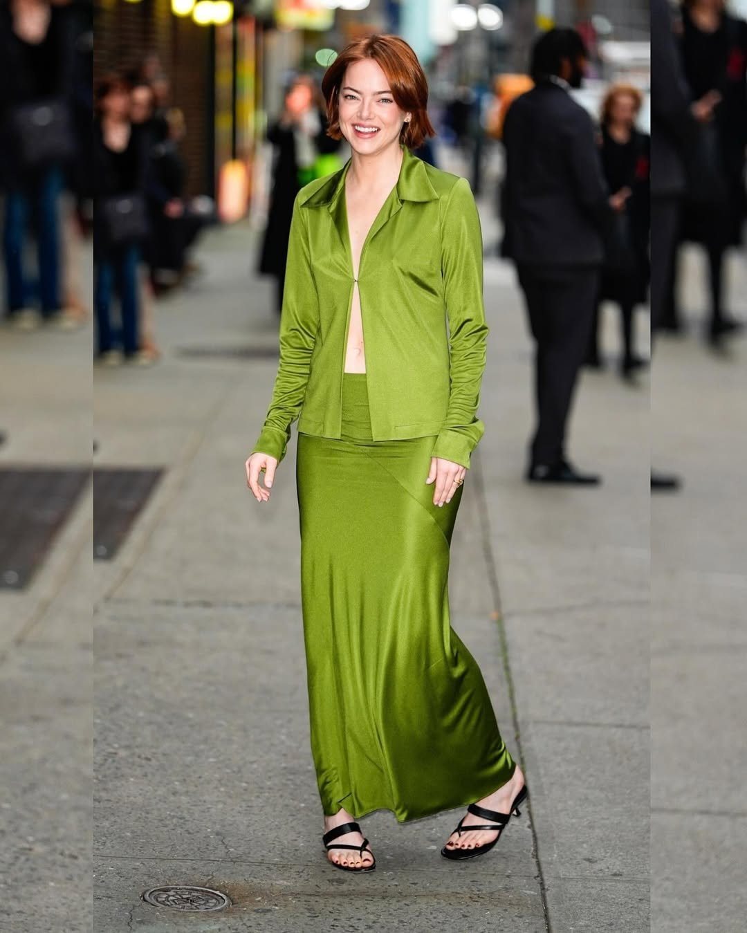 This silky green set has that effortless downtown elegance that feels very New York. The relaxed blouse and flowing skirt create a smooth, fluid silhouette that moves beautifully as she walks.