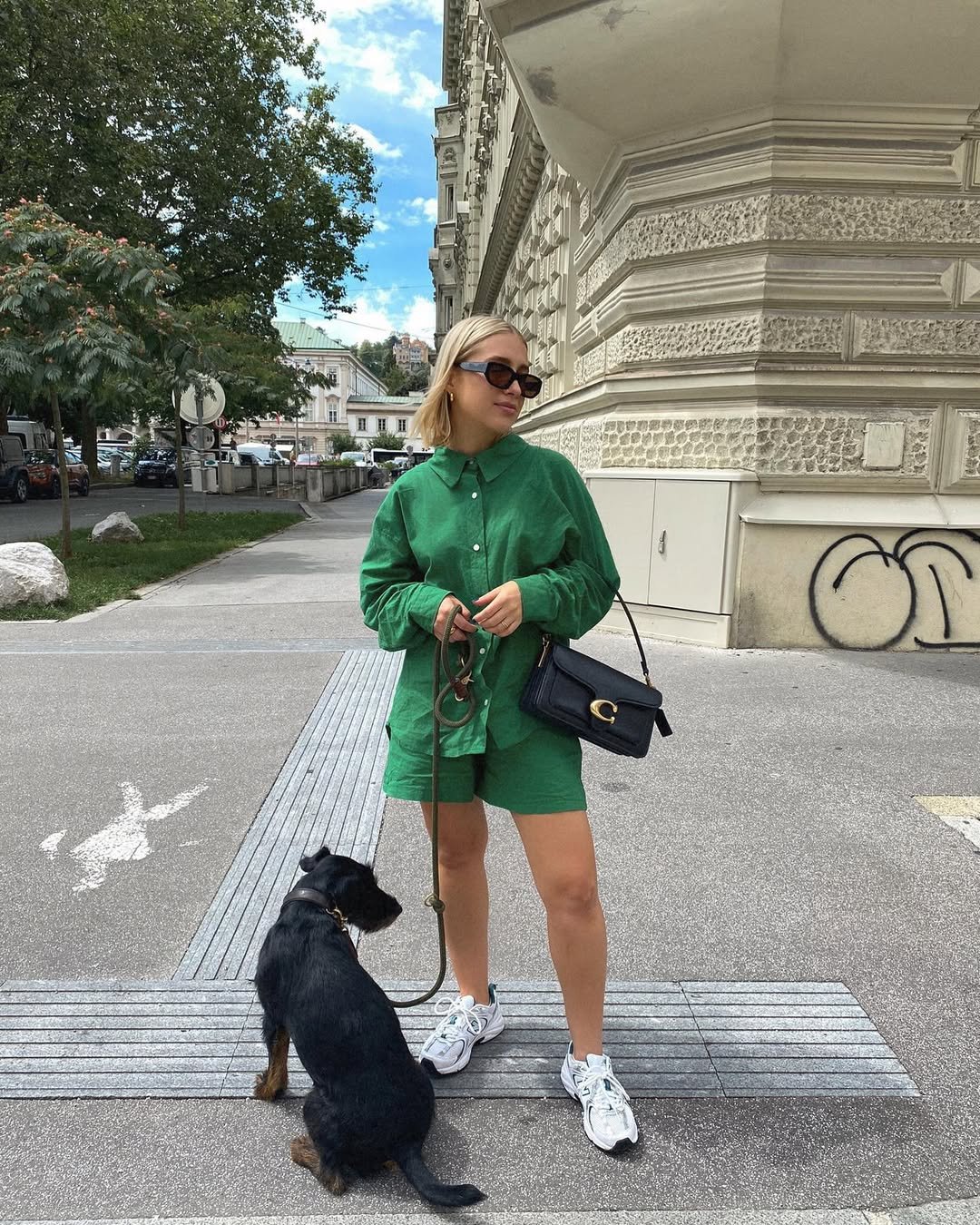 This look proves green can feel completely effortless. The relaxed shirt and matching shorts create that easy set energy that’s perfect for a casual day out.