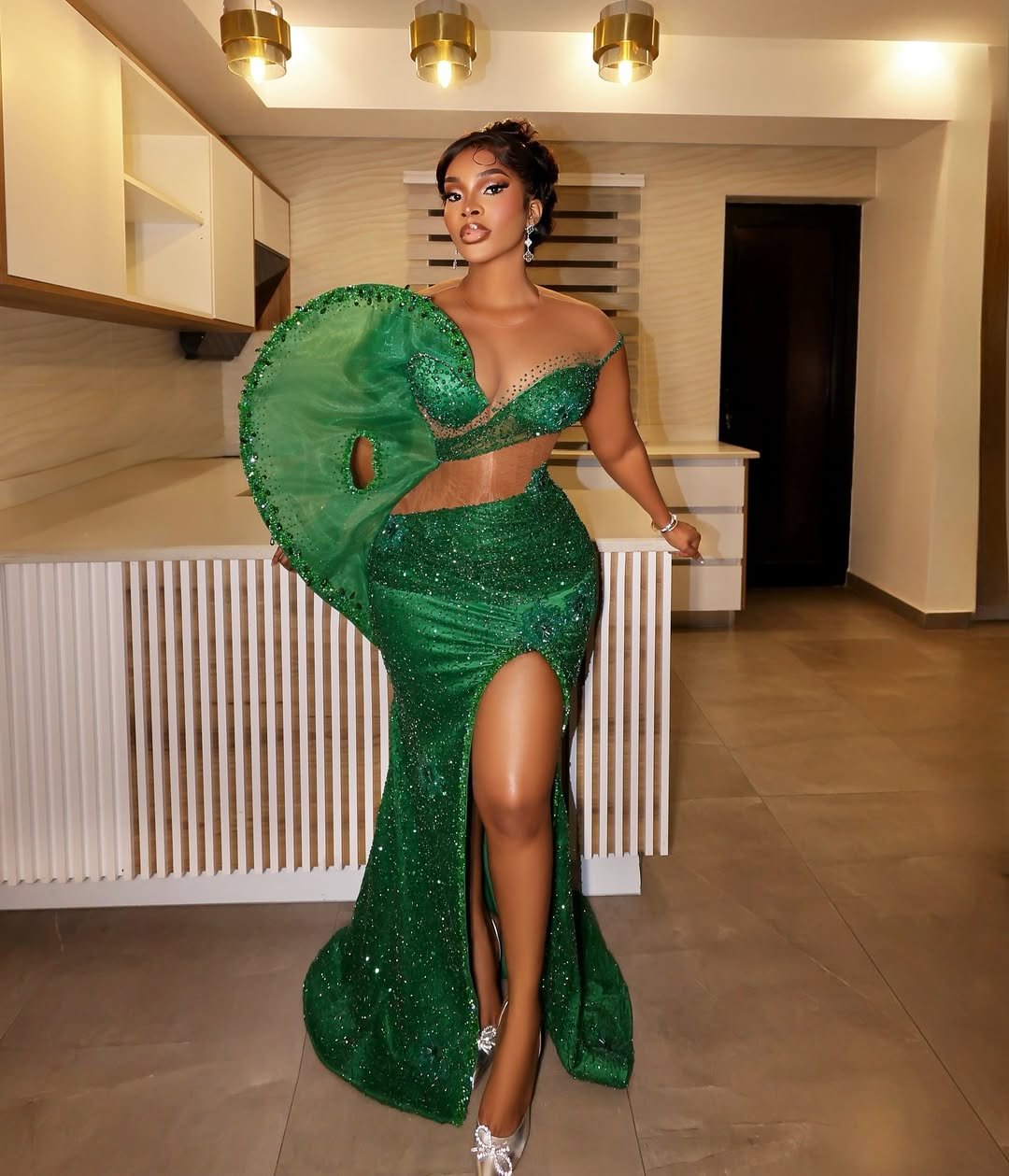 This dress doesn’t whisper elegance, it walks into the room and owns it. The shimmering emerald fabric catches the light beautifully, while the sculptural shoulder detail feels almost like wearable art.