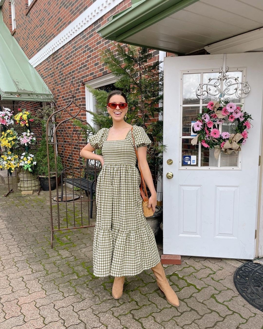 This look feels like sunshine after a long winter. The soft green dress has that light, airy movement that instantly brings spring to mind, especially paired with delicate accessories that keep the styling simple and sweet.