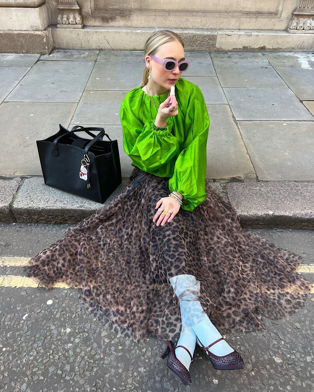 This outfit feels like a fashion editor’s idea of a fun afternoon in the city. The vibrant lime blouse instantly wakes up the look, while that airy leopard print skirt adds movement with every step. It’s bold, playful, and just a little bit unexpected in the best way.