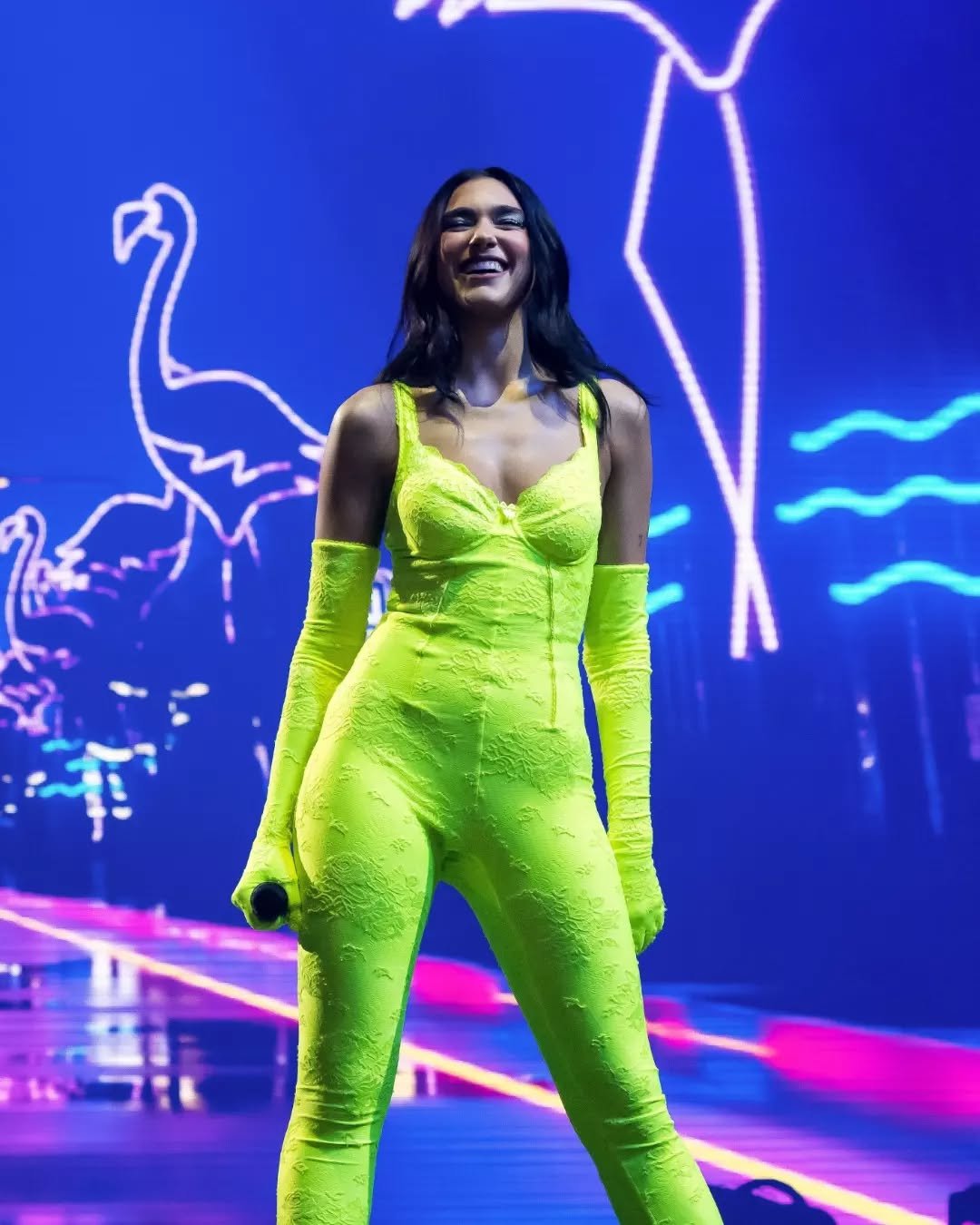 This outfit is pure stage presence. The neon green bodysuit paired with matching gloves creates a bold, electric look that practically glows under concert lights.