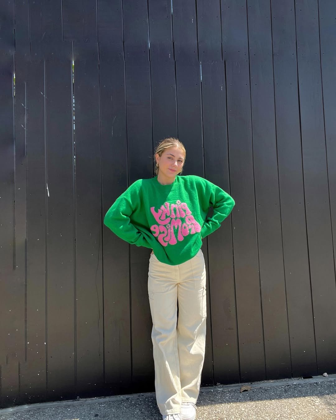 This look leans into cozy casual with a splash of personality. The oversized green sweatshirt with bold pink lettering instantly draws attention while keeping the outfit relaxed and easy.
