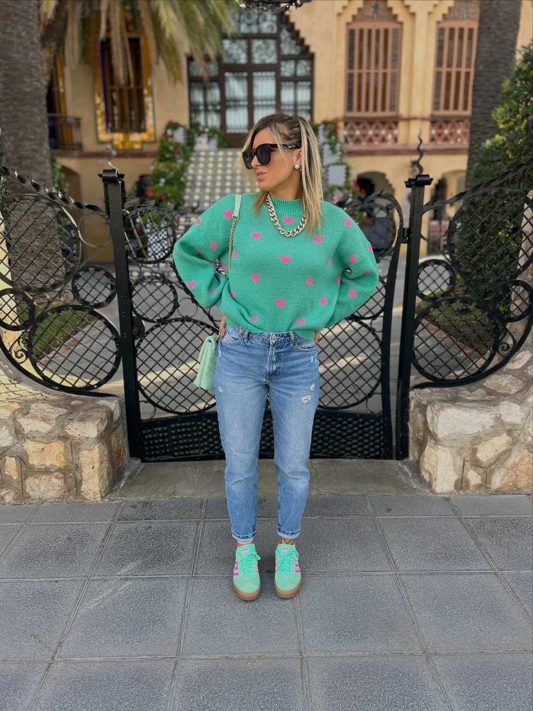 This outfit leans straight into joyful color. The soft green sweater dotted with tiny pink hearts instantly brightens the look, especially paired with classic blue jeans that let the knit take center stage.