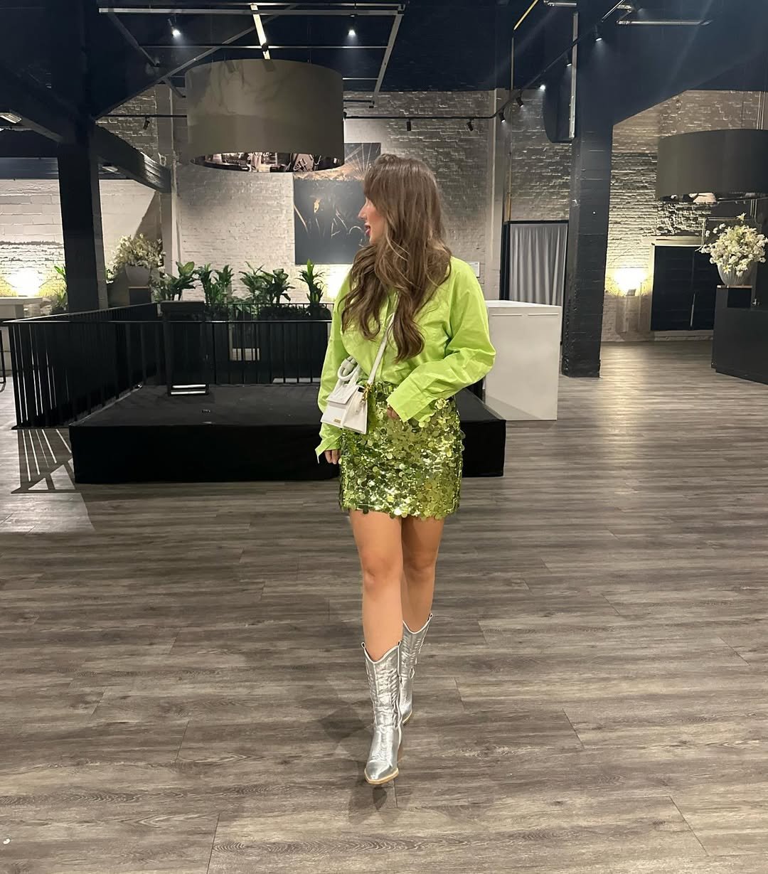 This outfit has that perfect “ready for the night” energy. The lime green blouse paired with the sparkling sequin mini skirt creates a fun contrast between relaxed and glam.