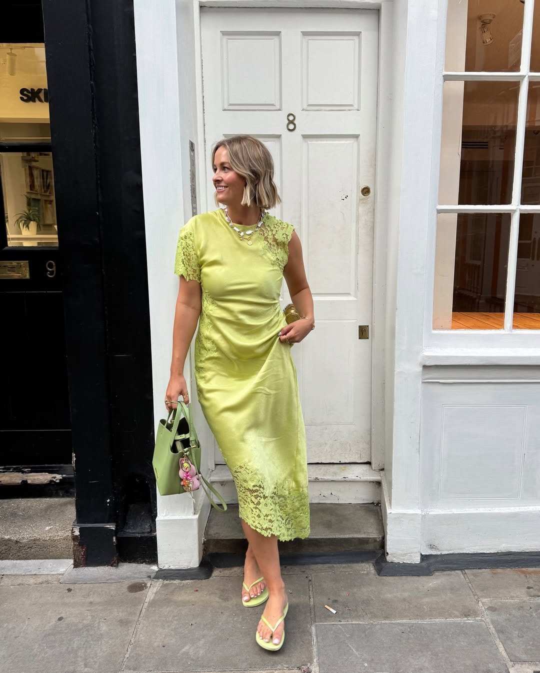 This look feels like a quiet little summer afternoon in the city. The soft lime dress with delicate lace trim brings a romantic texture that feels both vintage and modern.
