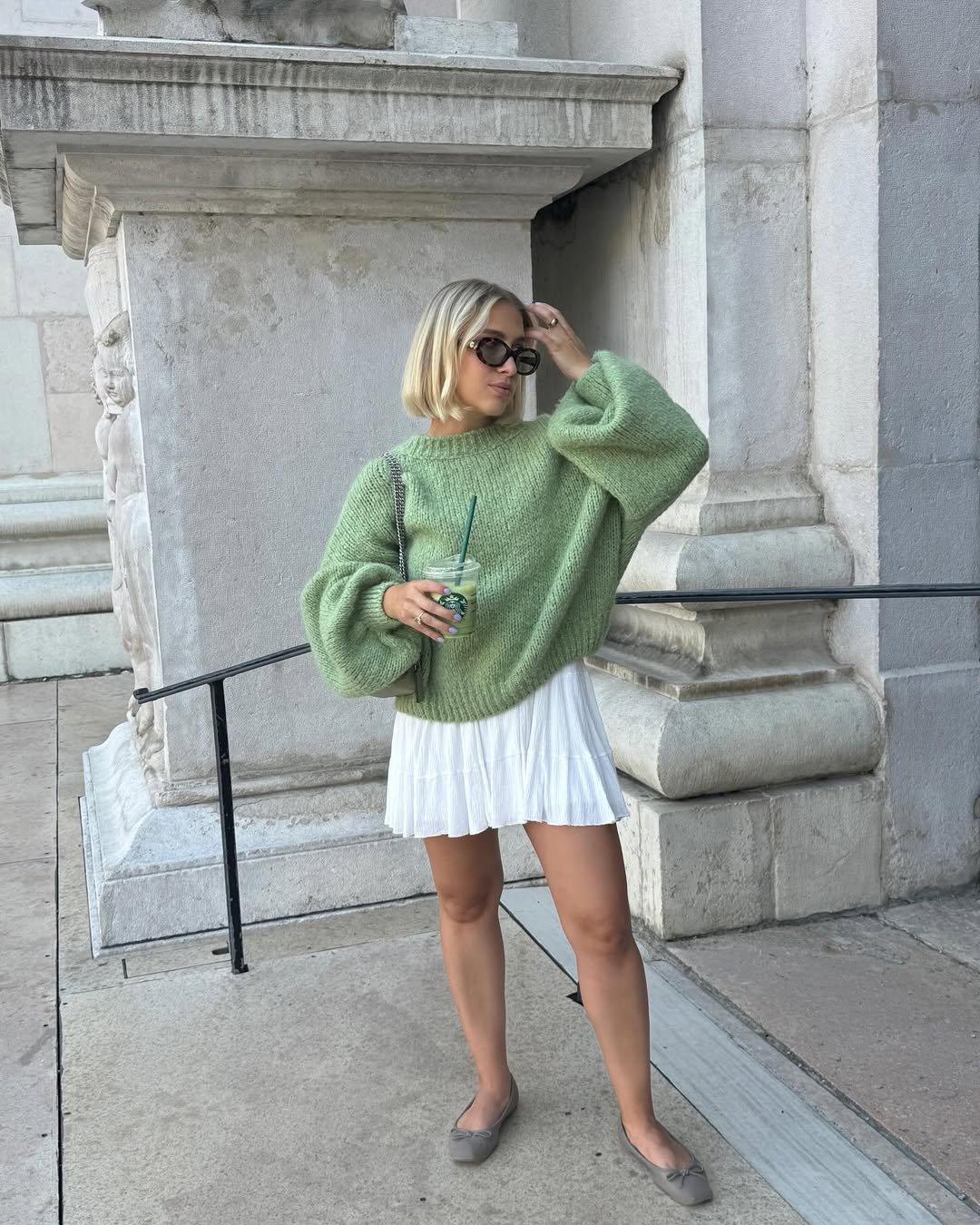 This outfit feels like a cozy little café stop waiting to happen. The oversized sage sweater paired with a crisp white pleated skirt creates that sweet balance between relaxed and polished.