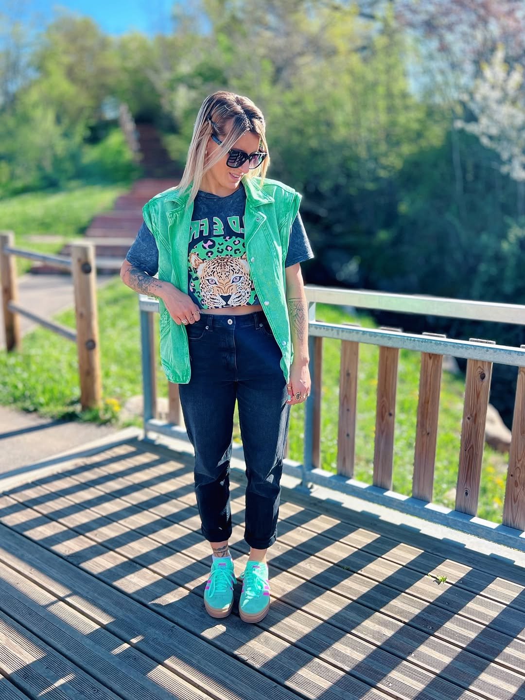 This look feels like a sunny afternoon walk where style just happens naturally. The bright green vest layered over a graphic tee brings a playful energy, especially paired with dark denim that keeps the outfit grounded.