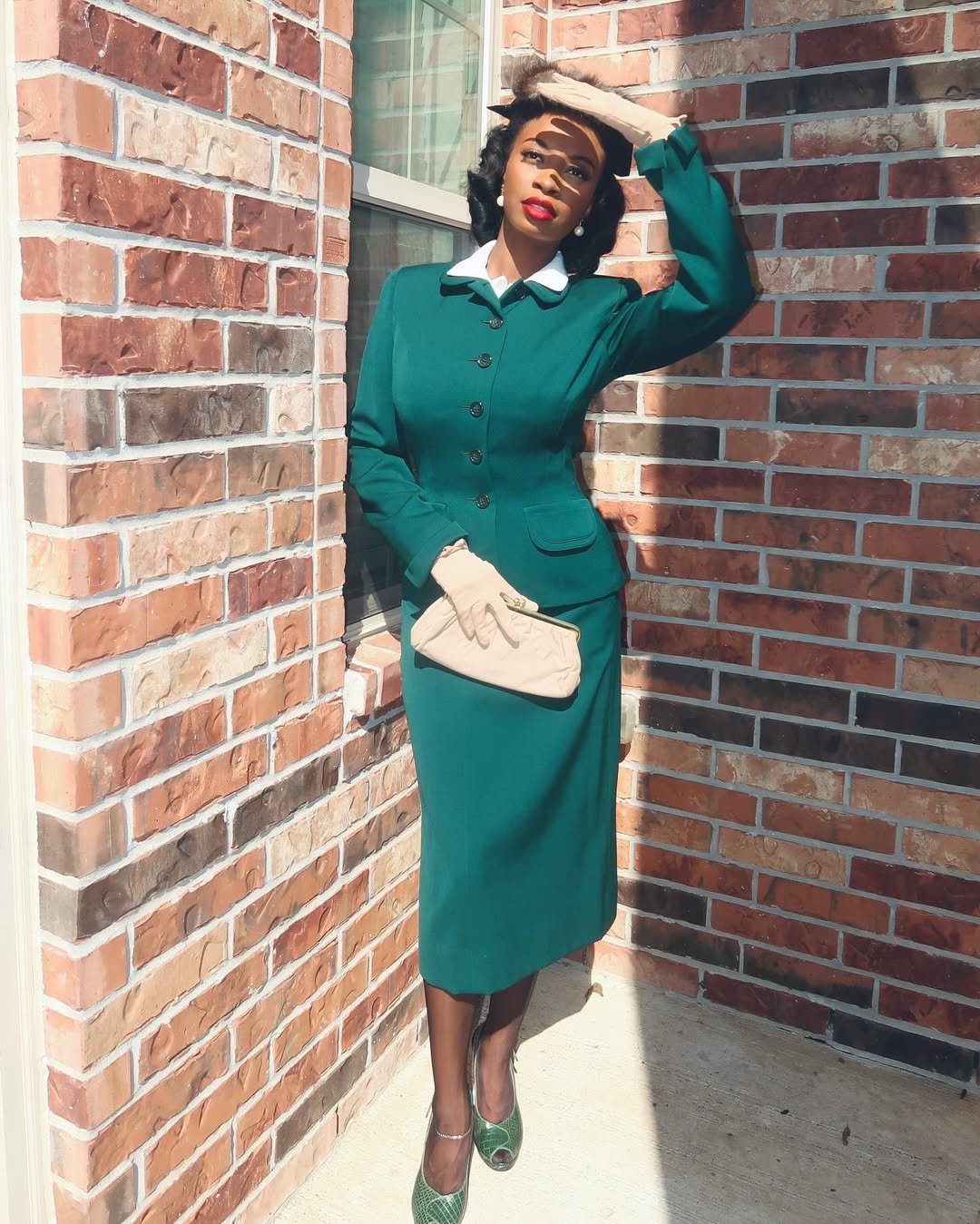 This look feels like stepping into another era in the best possible way. The structured emerald suit with the crisp white collar brings a classic vintage elegance that feels powerful and graceful all at once.