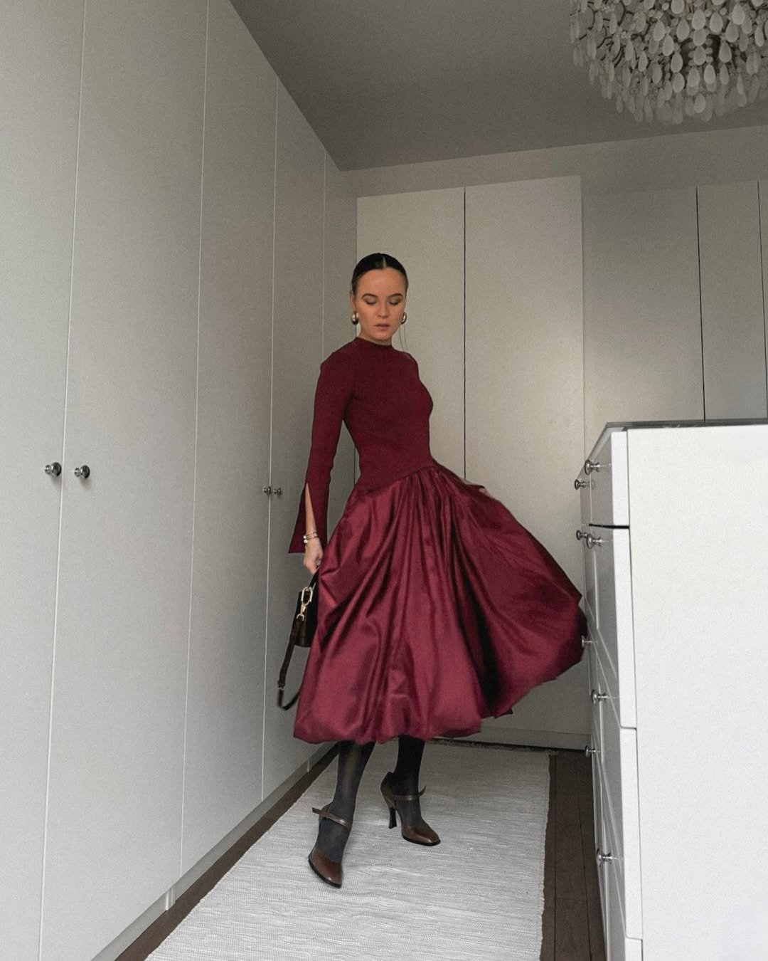 Leave it to @vanityxty to take corset chic to new heights. The structured leather bustier top is edgy enough on its own, but pairing it with a high-slit red satin skirt? That’s how you do holiday dressing with an edge. Throw in sleek pointed heels and a mini bag, and you’ve got an outfit that looks straight out of a luxe rooftop soirée.