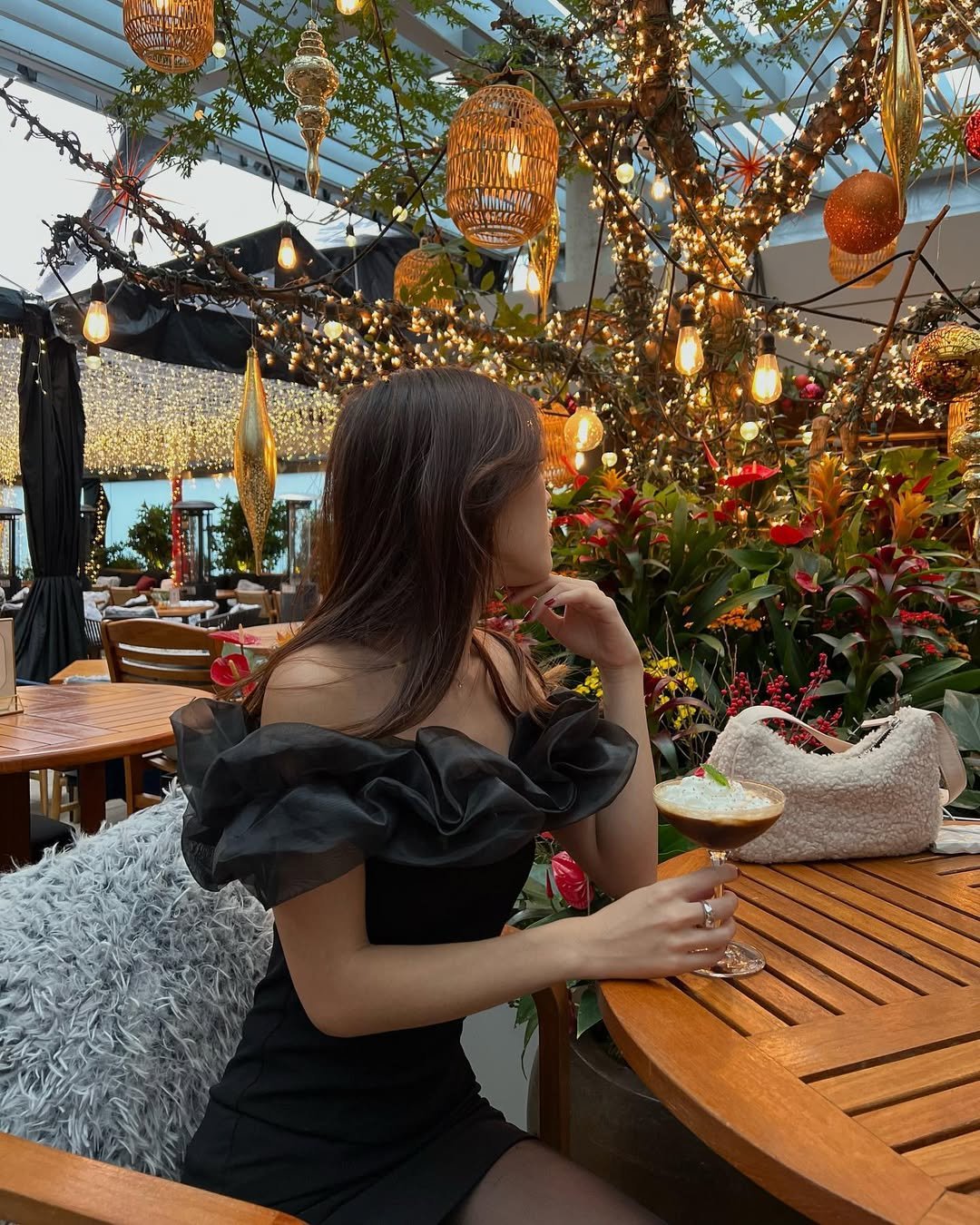 Her knit beanie adds just the right texture, and the cozy backdrop with lights and garland only enhances the winter wonderland energy. This is the kind of look that turns heads at a casual coffee catch-up or a festive stroll through downtown lights.