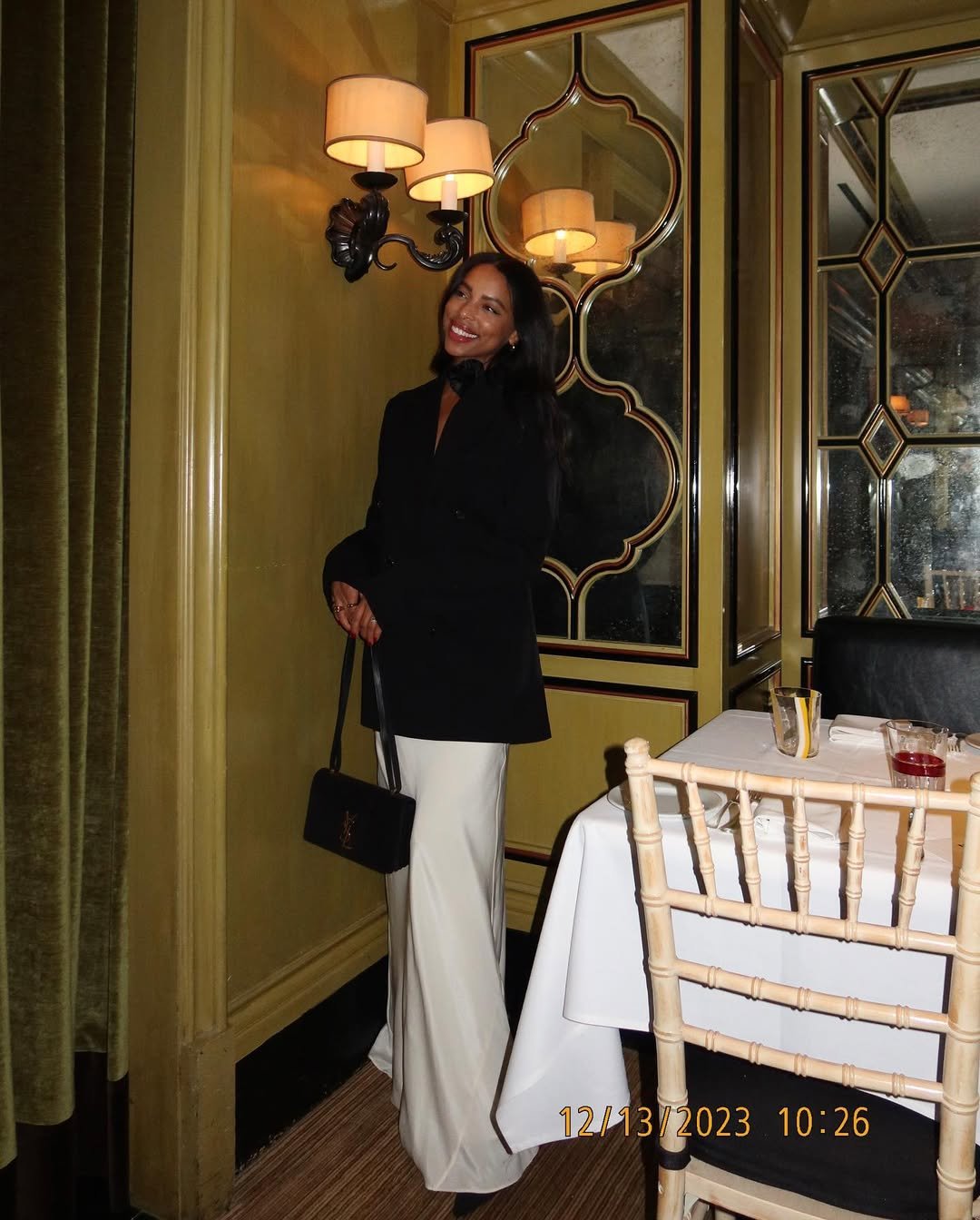 Now this is how you do understated glam. A tailored black blazer over crisp white pants? Timeless. Add in that YSL bag and pointed pumps, and suddenly you’re that guest who looks like she floated in from a Vogue feature. The hair? Down and polished. The pose? Casual, but you know she planned it.