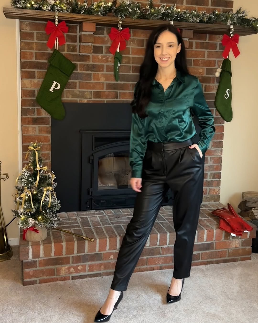 Silk meets edge in this gem-toned look by @ohheyitssteph222. The emerald green satin blouse is rich and moody, and when paired with black leather trousers, it becomes the kind of outfit that says “I own the guest list.” Classic black pumps complete the picture.