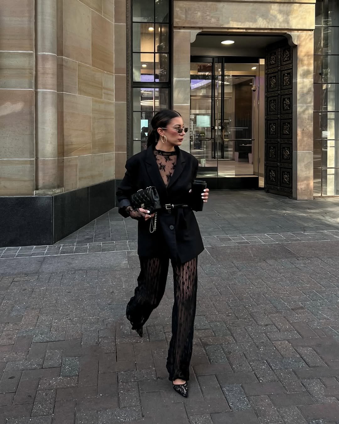 @Ninaoliviaxo pulls up with something bold and unapologetically chic. She’s draped in a sheer black lace top, belted oversized blazer, and lace pants that whisper “high fashion” and scream confidence. Oh, and she’s holding coffee like it’s part of the outfit. Iconic.