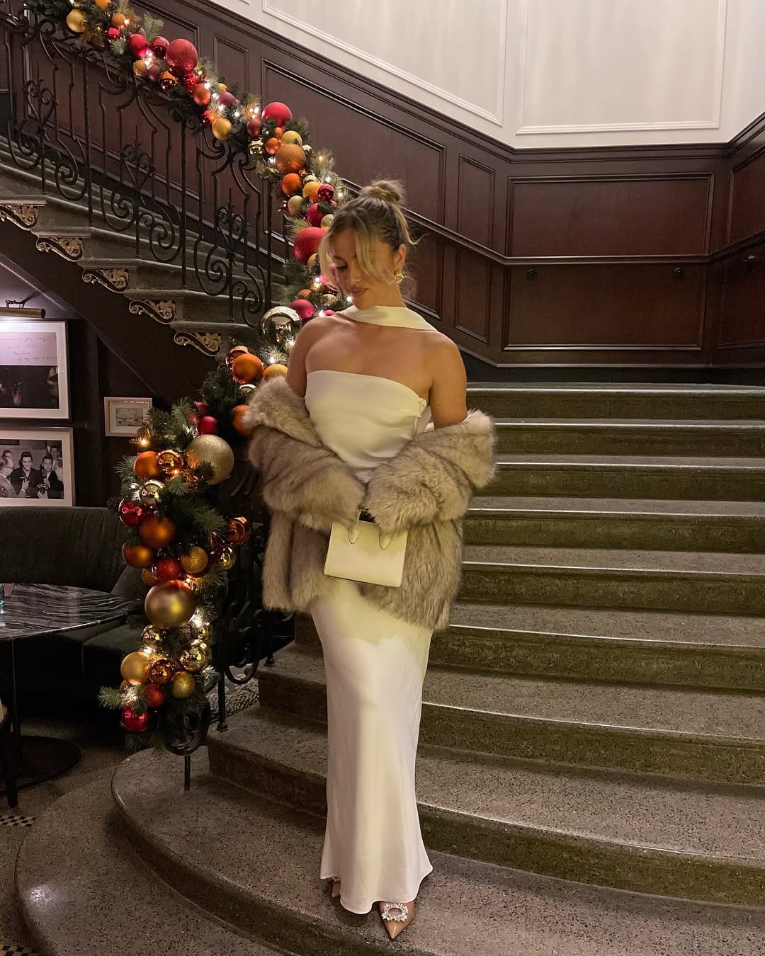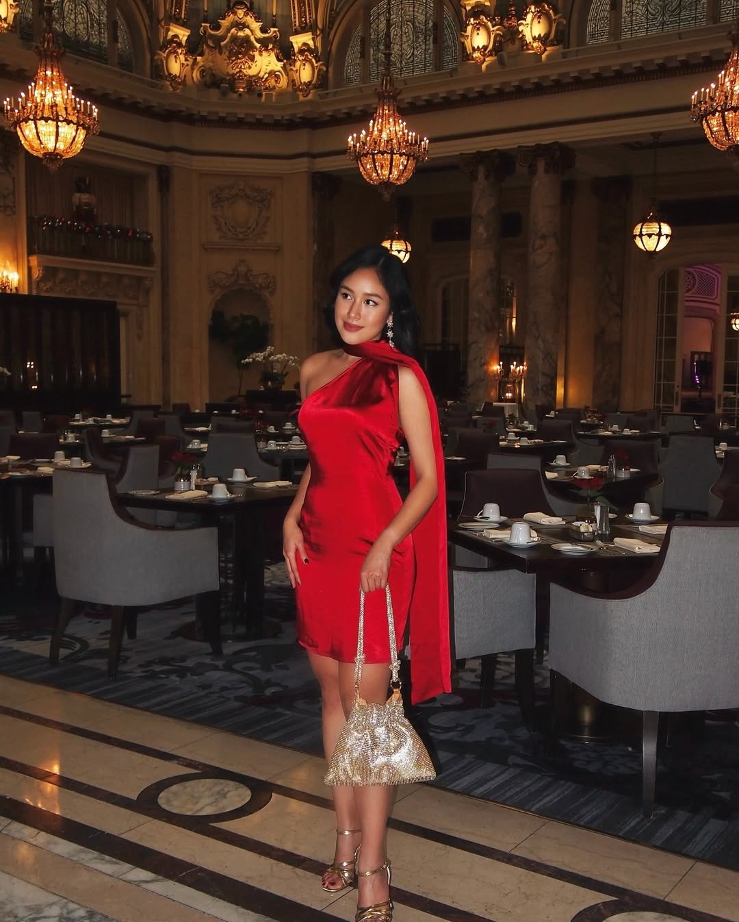 And can we talk about that ballroom setting? It’s giving holiday gala in a palace, not your average neighborhood get-together. Paired with gold heels and a textured evening bag, it’s a total look.