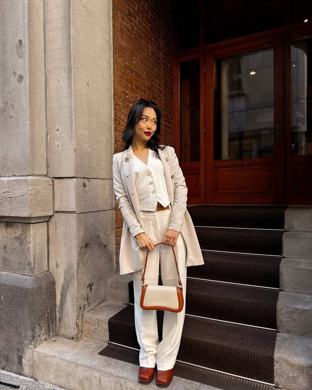 There’s something about a crisp winter white suit that just hits different during the holidays. @liyaahuang nails it with a three-piece cream ensemble that feels equal parts powerful and polished. The blazer is sharp, the vest is tailored to perfection, and those high-waisted trousers? Chef’s kiss. She adds a warm pop with chestnut-toned platform heels and a matching-trimmed bag that ties the whole thing together.
