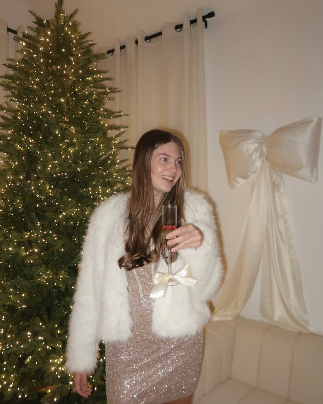 @madewith.rach proves that delivering presents and looking like one is a fashion power move. She’s styled a boxy ivory sweater with a glimmering mini skirt and sheer black tights—an ensemble that’s equal parts cozy and glam. The western booties give it just the right amount of attitude, like she might break into a line dance after dinner.