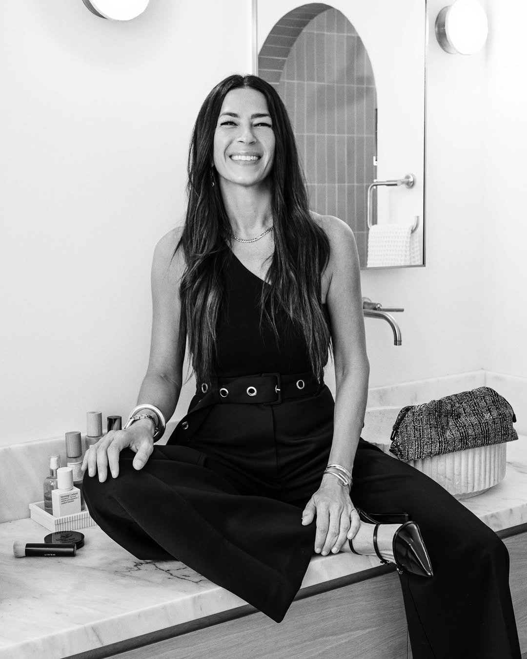 @Rebeccaminkoff proves that you don’t need glitter to sparkle. Her one-shoulder black jumpsuit is pure minimalist magic—elevated by grommet details and a cinched waist that’s all about sharp tailoring. She’s perched on a counter, but this look could easily command a whole room.