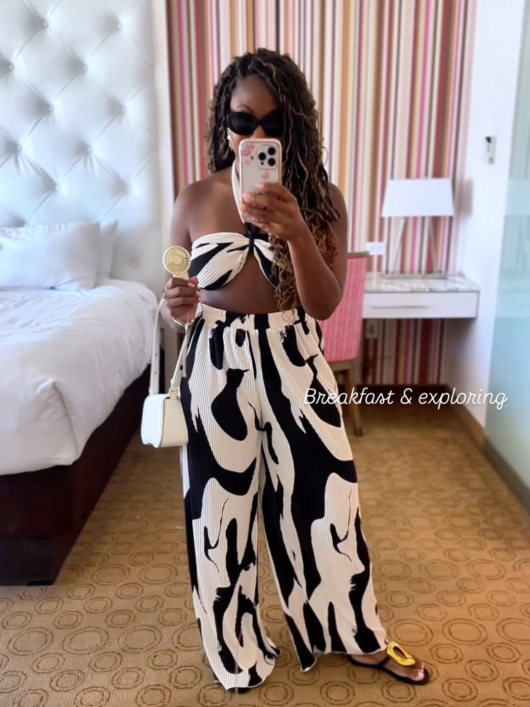 A black and white printed set with wide-leg trousers makes a strong case for statement mornings. The bandeau-style top keeps it sleek, while the high-waisted pants flow with every step.
