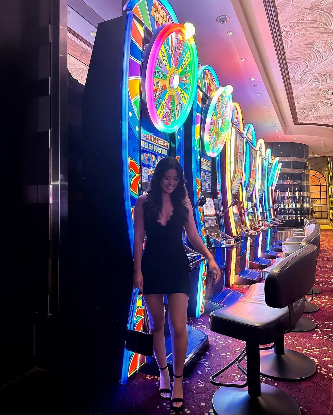 There’s something so chic about a simple black mini in a sea of slot machines. The clean lines, delicate straps, and ankle-strap heels make this look feel sleek and confident.