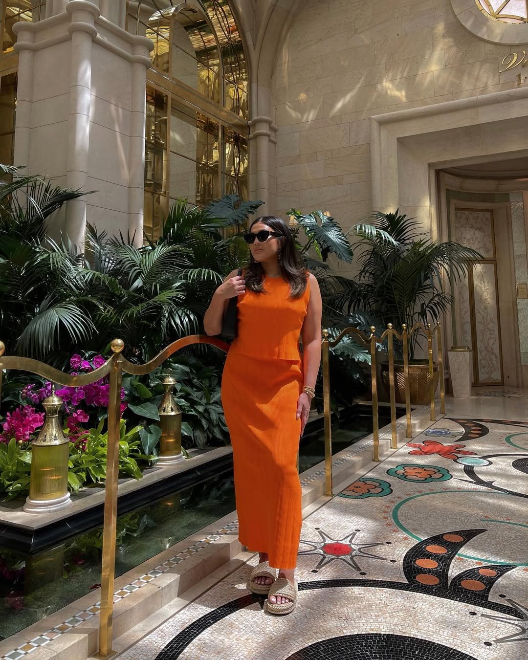A ribbed orange midi dress against lush greenery and marble floors is pure statement simplicity. The fitted silhouette keeps it sleek, while woven slides soften the look.