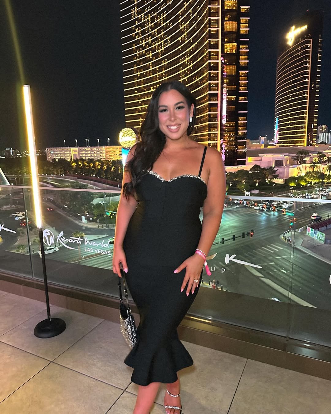 A fitted black midi with a subtle flared hem is never the wrong choice in Vegas. The delicate straps and crystal trim neckline give just enough sparkle without going overboard. It’s refined, feminine, and completely timeless.