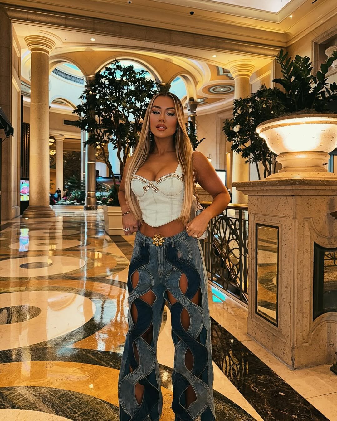 This look leans all the way in. A structured corset top paired with bold cutout denim feels daring in that confident Vegas way. The gold belt detail pulls everything together and gives it a touch of glam against the marble floors.