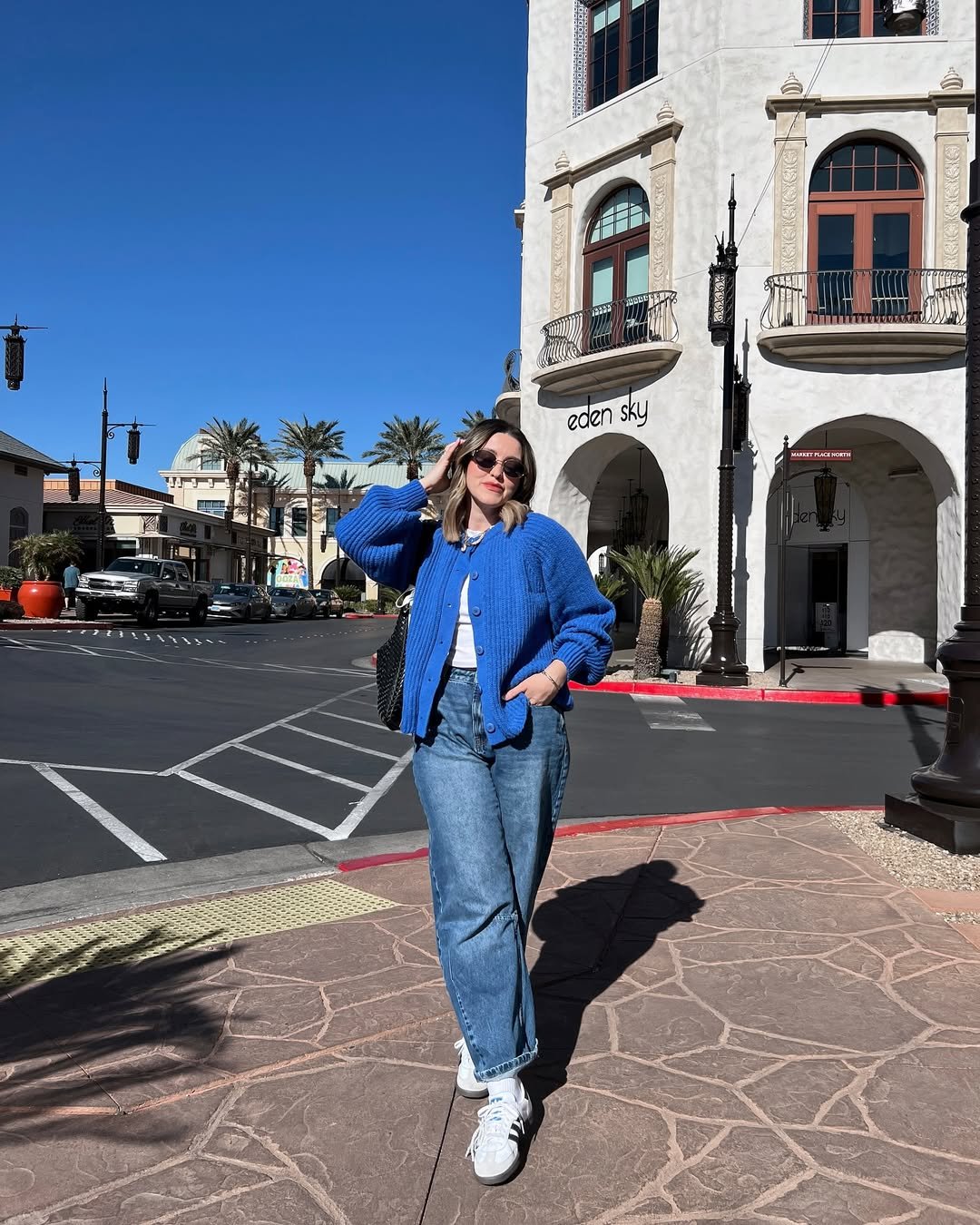 A cobalt cardigan over a white tee and relaxed jeans feels effortless against palm-lined streets. Sneakers make it practical, but the bold blue keeps it interesting.