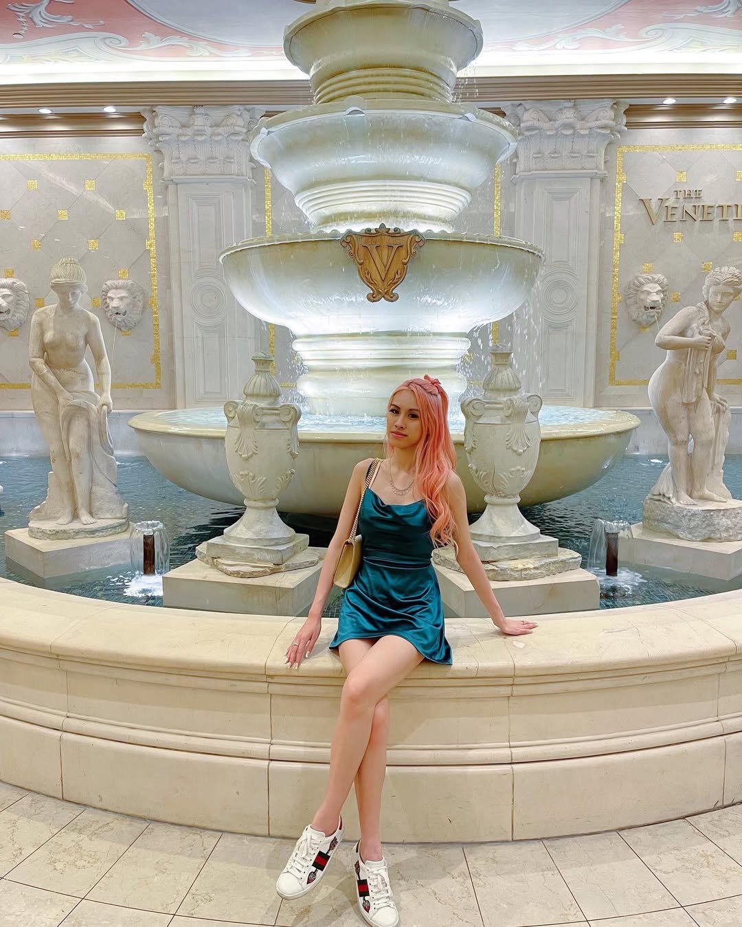 A silky emerald mini against that grand Venetian fountain feels like a scene from a modern fairytale. The draped neckline, soft sheen, and delicate gold shoulder bag give it that refined edge, while white sneakers keep it grounded and cool. And the pink hair? It adds just enough personality to make the whole look unforgettable.