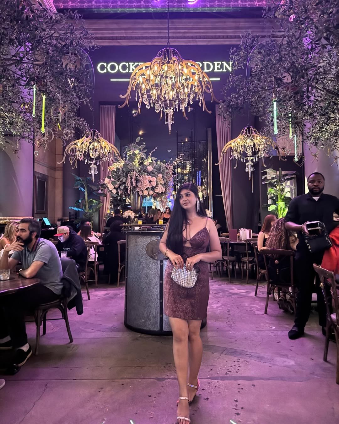 A ruched lavender mini under cascading crystal lights feels straight out of a dream. The soft pastel shade paired with white heels and a petite shoulder bag gives it a romantic edge that still feels Vegas-worthy.