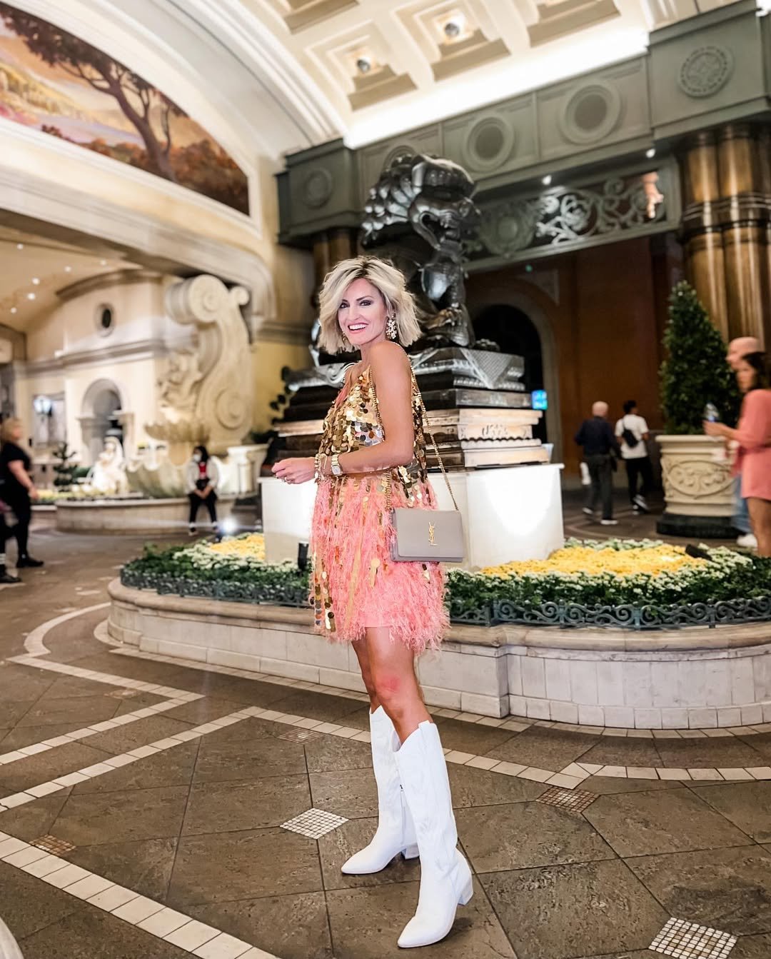 Sequins on top, soft pink fringe below, and crisp white boots. It feels playful, glamorous, and completely Vegas-ready. The movement of the fringe adds texture without feeling heavy.