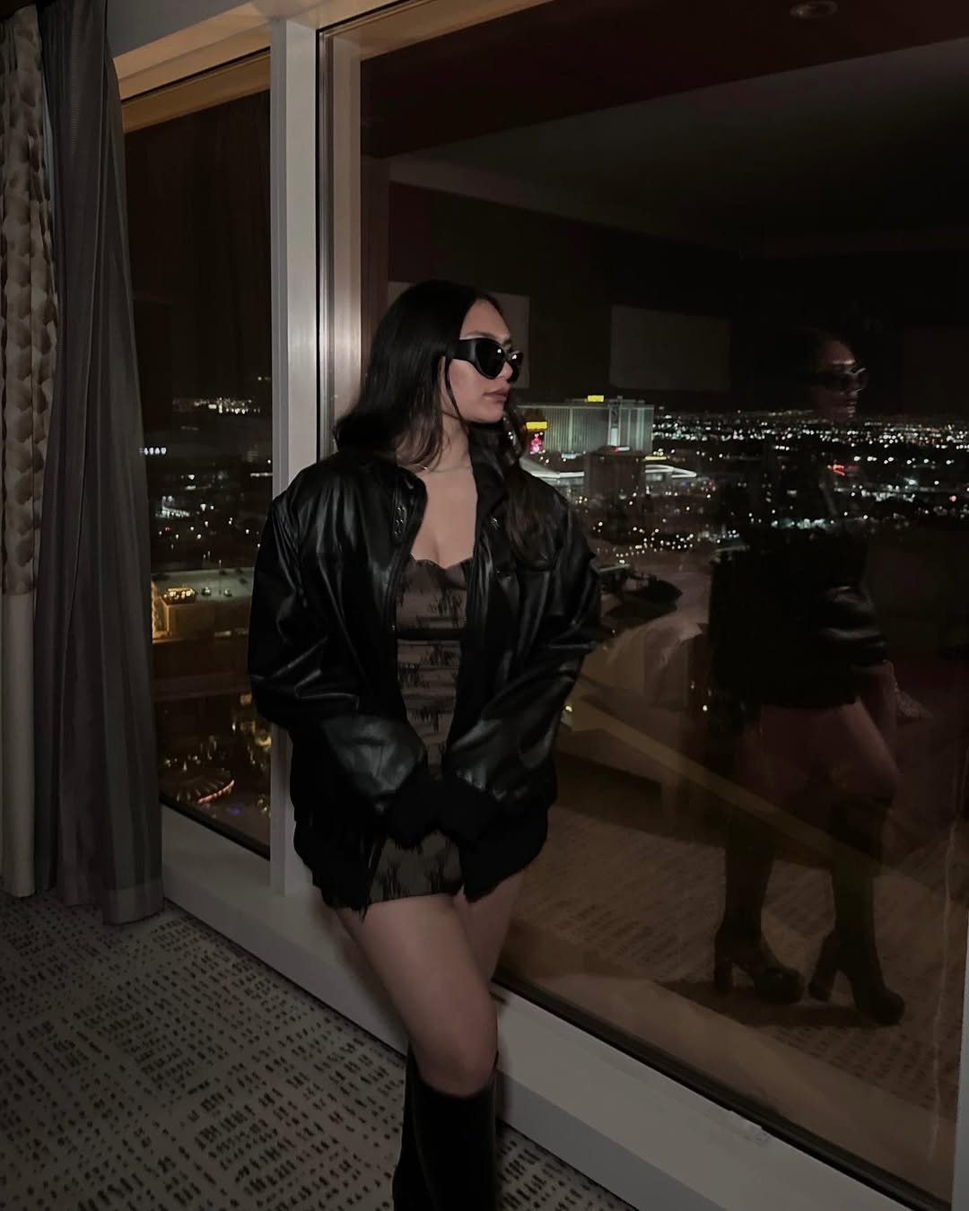 Vegas at night calls for lace. This sheer long-sleeve mini layered over a structured velvet bodice feels equal parts sultry and polished. Paired with sheer tights and embellished heels, it’s the kind of outfit that turns a balcony into your personal runway.