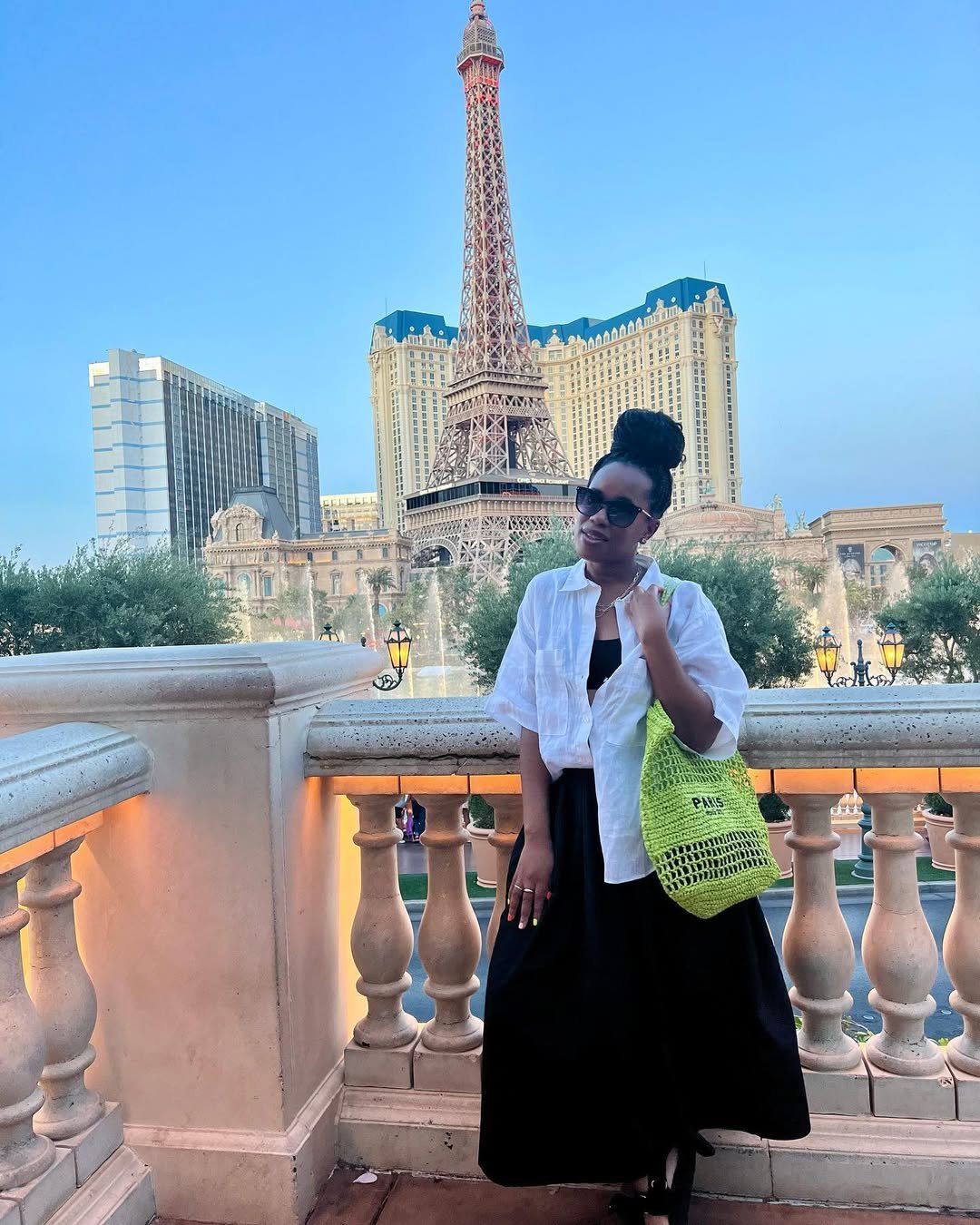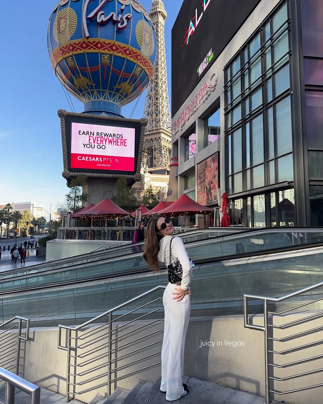 A fitted white set under the Paris balloon feels fresh, crisp, and just a little bit glam. The long-sleeve top and flared pants keep it sleek, while that black sequin shoulder bag adds a wink of sparkle that says, yes, I’m in Vegas.