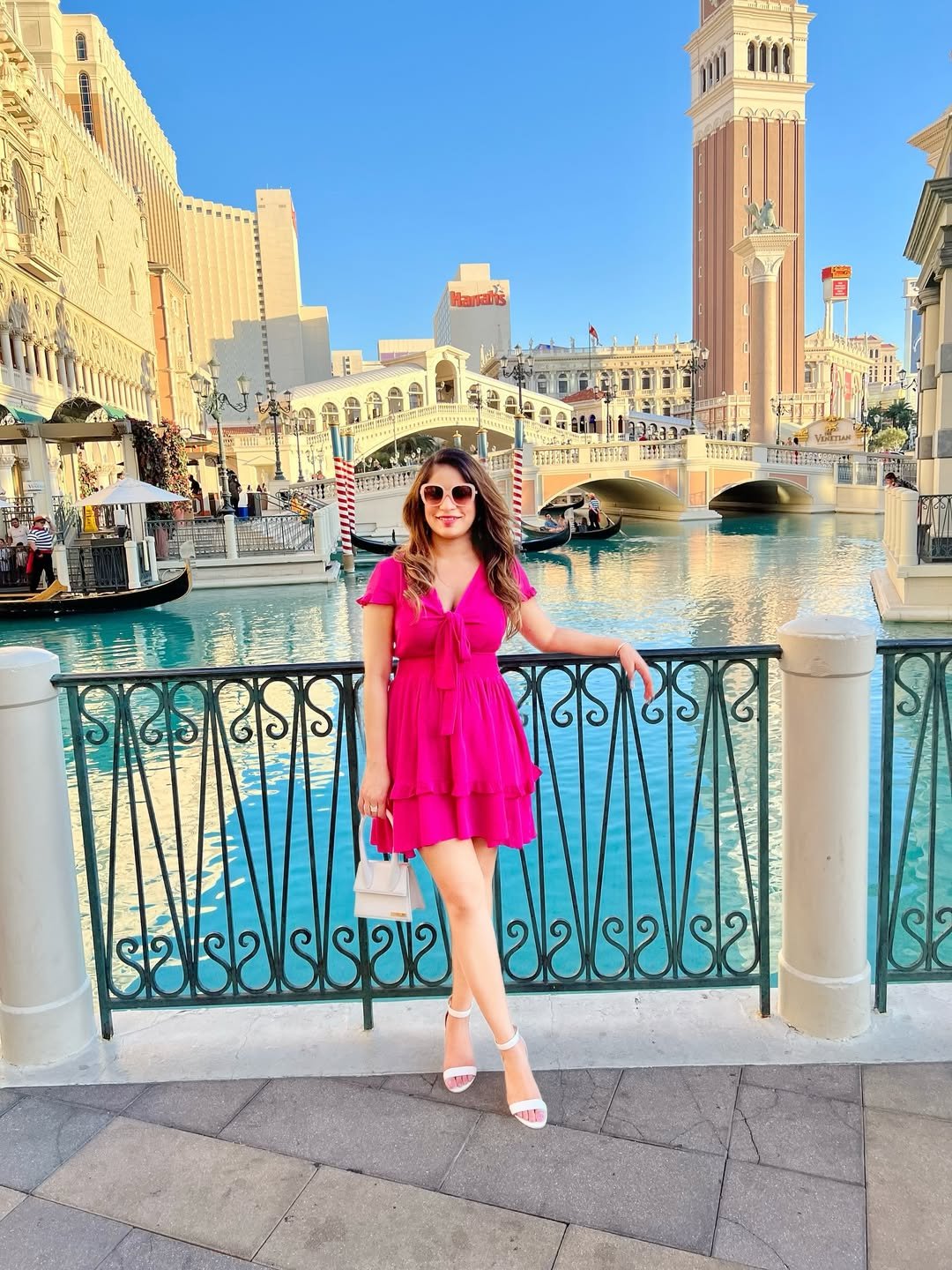 A bright pink ruffled mini dress against the turquoise Venetian canals feels playful and photogenic. The flutter sleeves and tiered skirt bring movement that makes every step feel lighter.