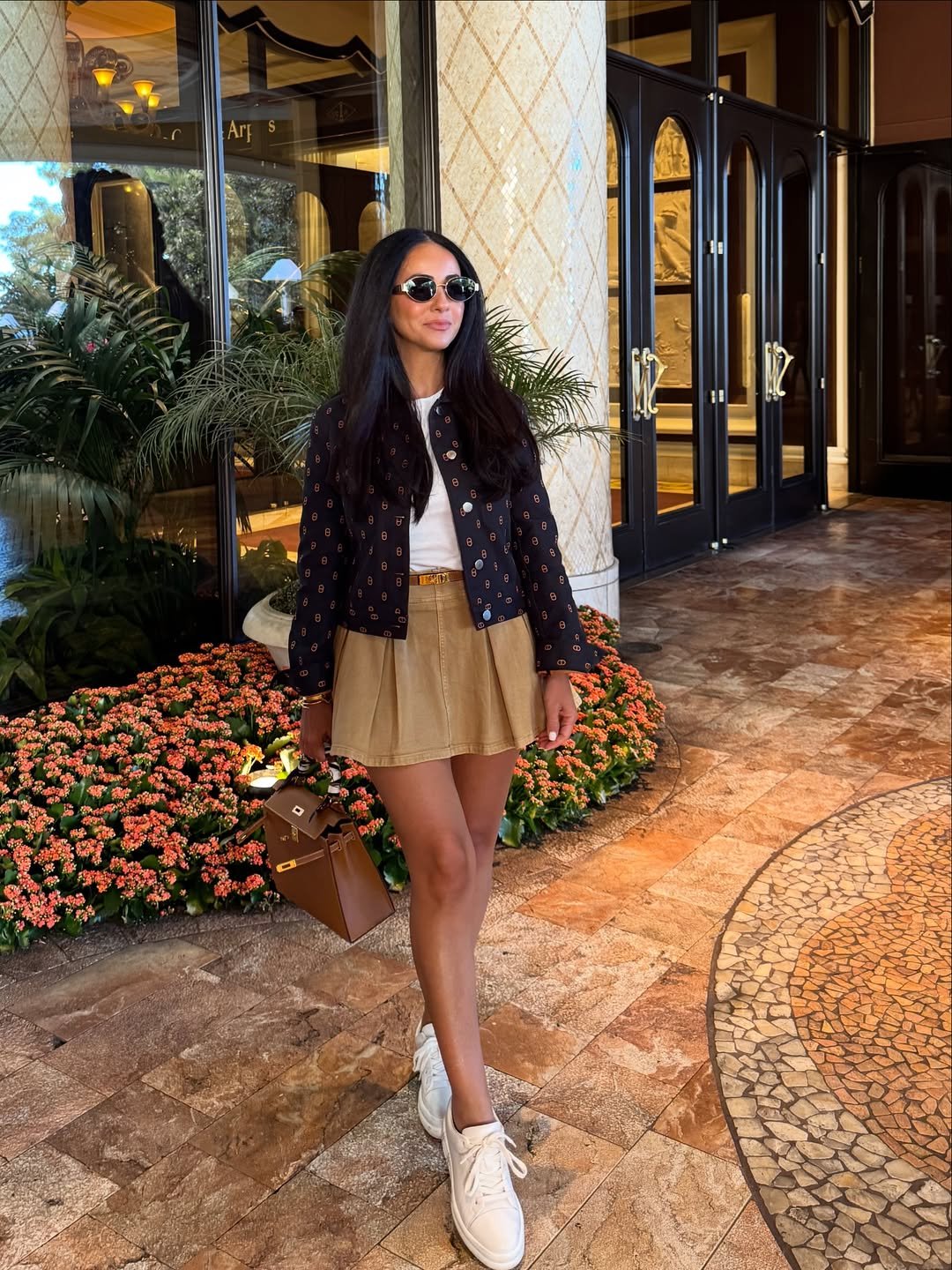 A tailored mini skirt with a patterned jacket and white sneakers feels crisp and composed. The structured handbag adds that quiet luxury touch against the warm stone backdrop.