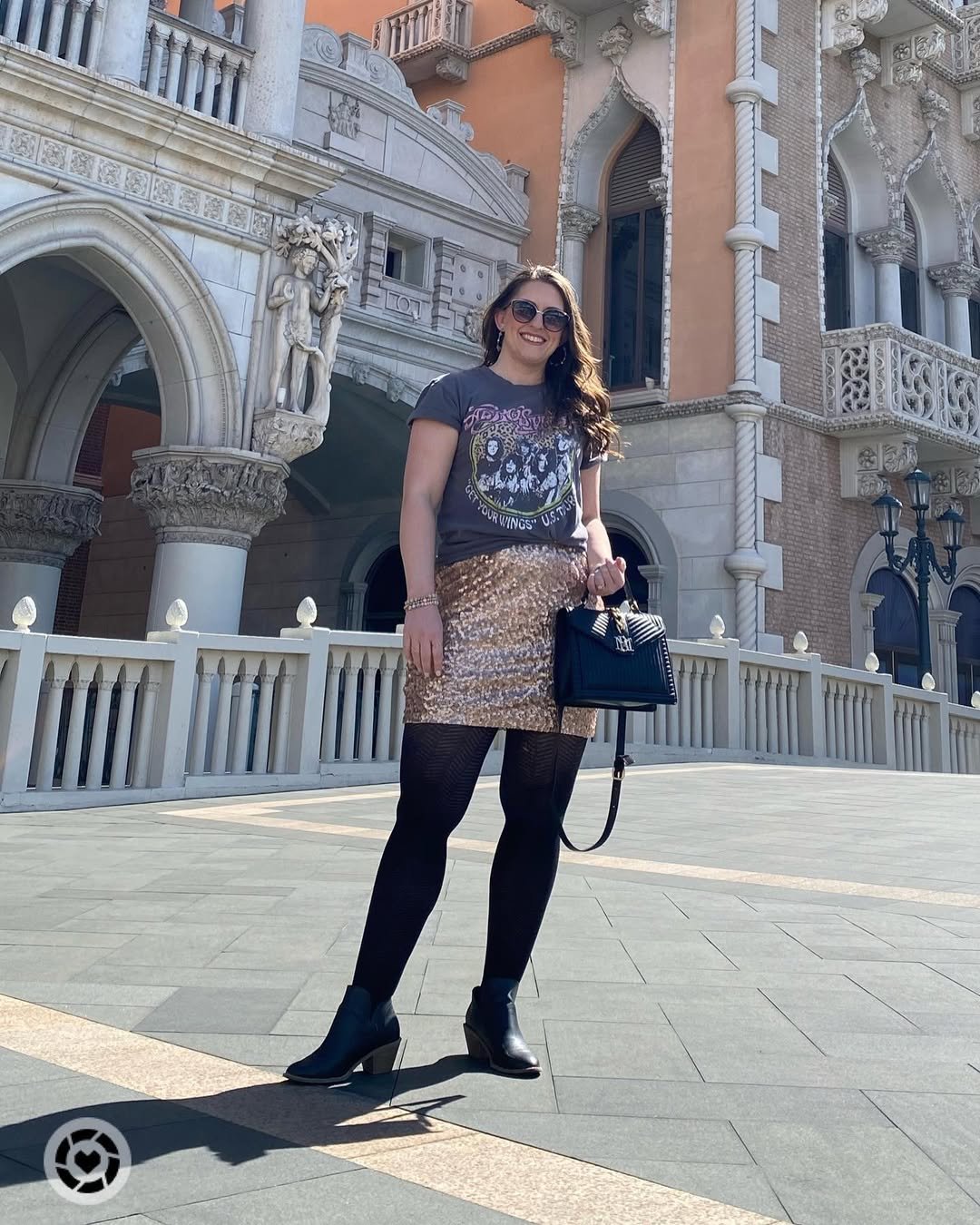 A vintage-inspired graphic tee tucked into a gold sequin mini skirt is that cool-girl Vegas formula. The black tights and ankle boots keep it grounded, while the sparkle does what sparkle does best.