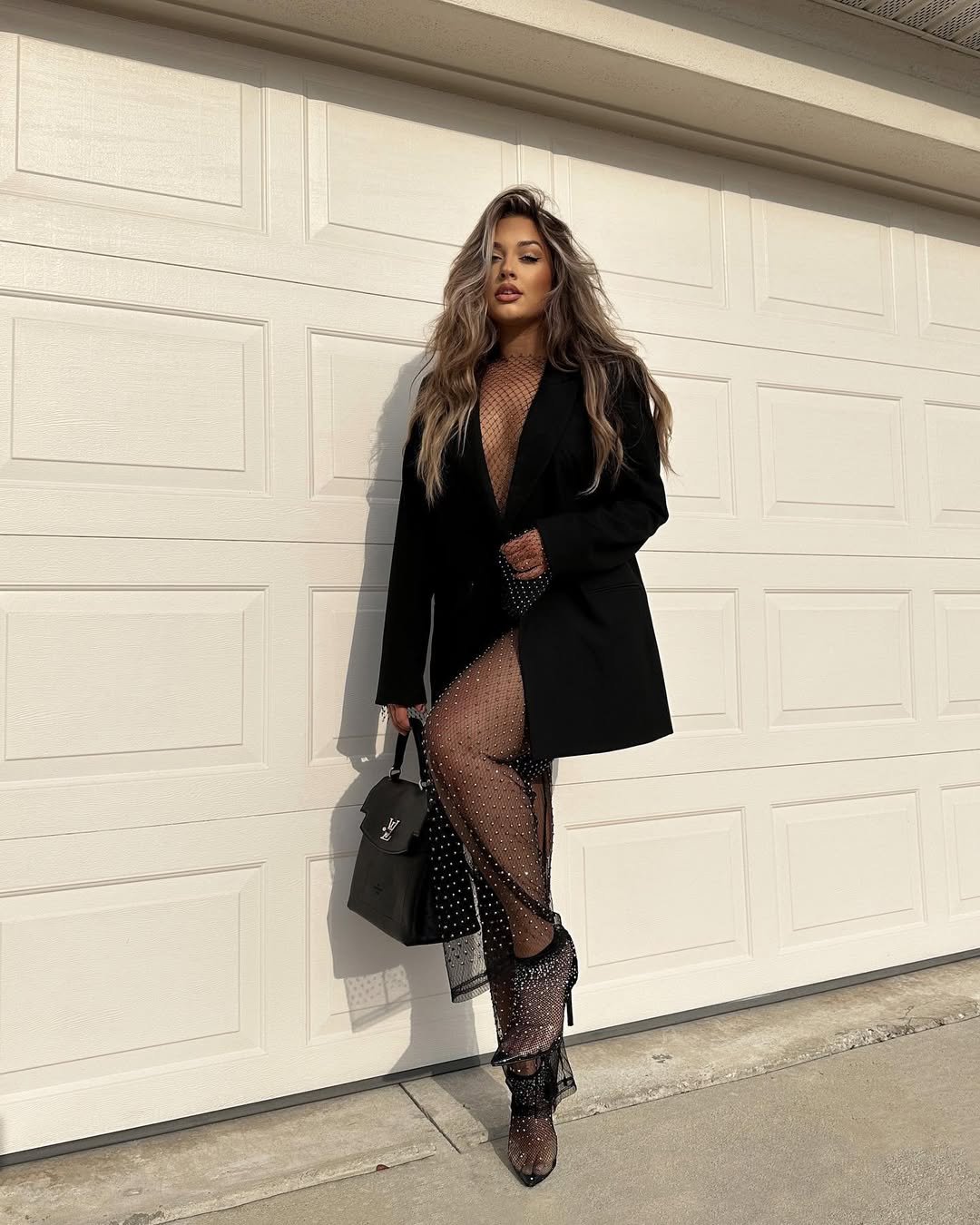 A sheer rhinestone dress layered under a tailored black blazer is bold in the best way. The sparkle catches the light, while the structured jacket reins it in and keeps it fashion-forward instead of flashy.