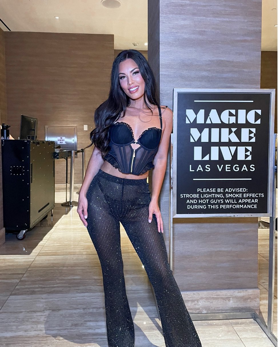 A structured corset top paired with sheer, glittering flared pants in front of the Magic Mike Live sign? That’s commitment to the theme in the best way.